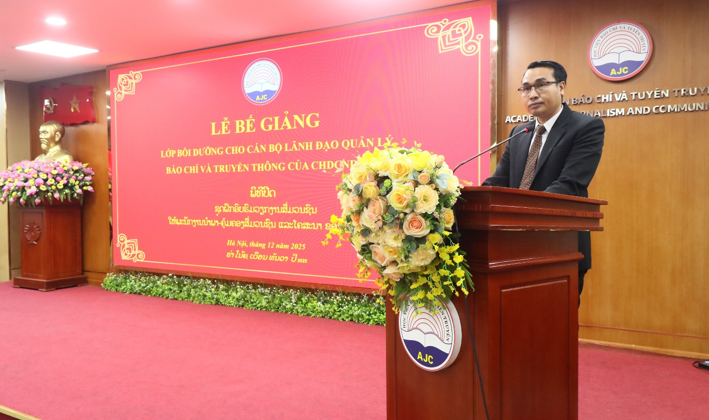 Phát biểu Bế giảng lớp bồi dưỡng, PGS,TS. Phạm Minh Sơn, Giám đốc Học viện chúc mừng 15 học viên lớp bồi dưỡng công tác quản lý báo chí dành cho cán bộ quản lý báo chí của nước CHDCND Lào đã xuất sắc hoàn thành khóa học sau 2 tháng nghiên cứu, học tập tại Học viện Báo chí và Tuyên truyền. Với tinh thần tích cực, nghiêm túc, Lớp bồi dưỡng công tác quản lý báo chí dành cho cán bộ quản lý báo chí của nước CHDCND Lào năm 2025 đã hoàn thành toàn bộ nội dung chương trình, kế hoạch đề ra.