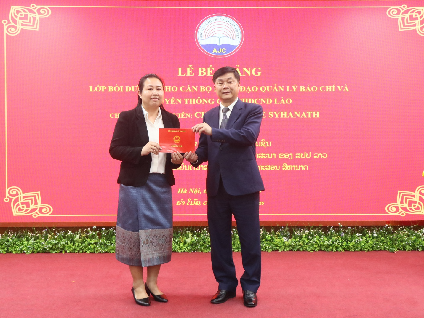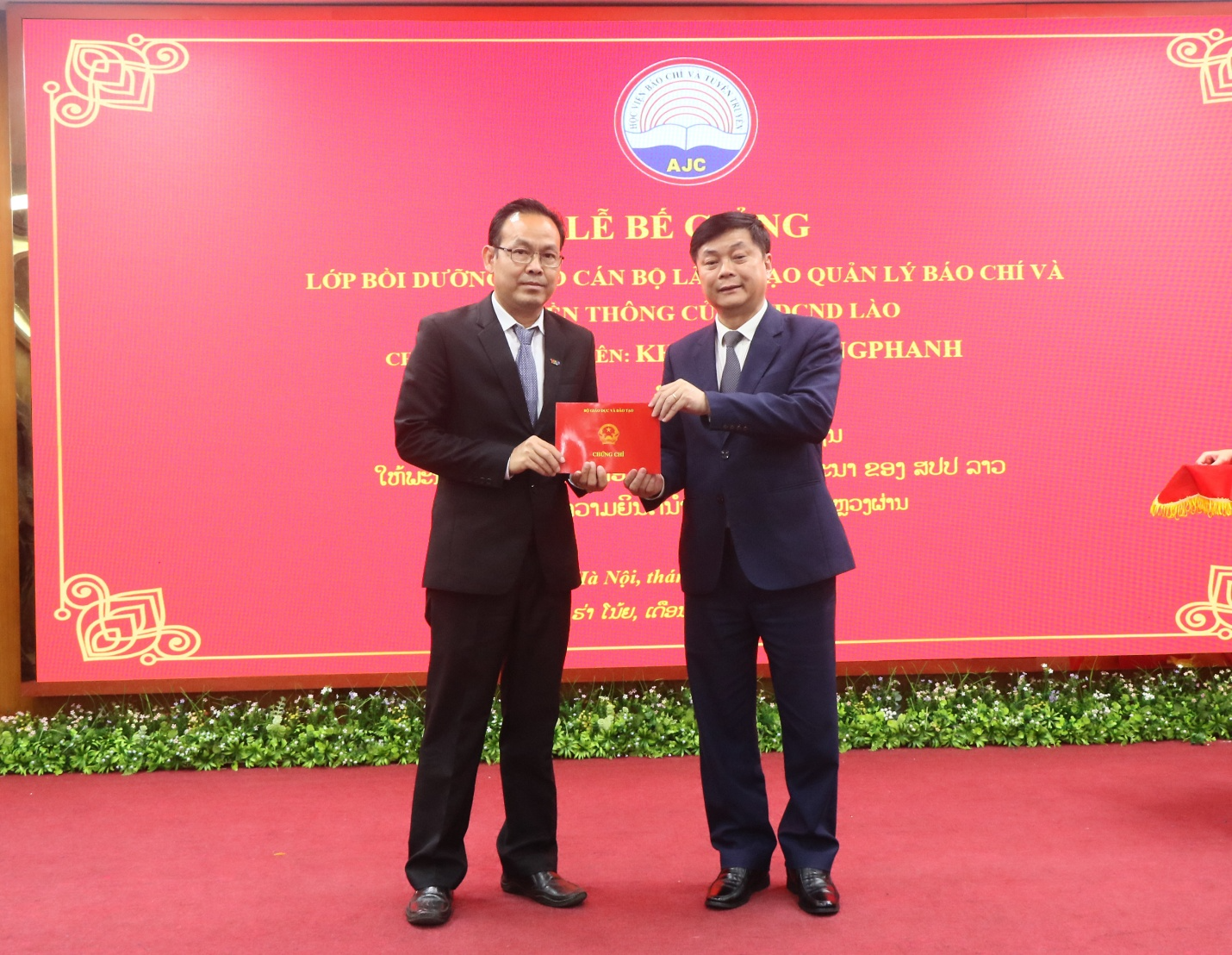 Tại Lễ Bế giảng, học viên lớp bồi dưỡng cho cán bộ lãnh đạo quản lý báo chí và truyền thông của nước CHDCND Lào năm 2025 vinh dự được PGS,TS. Phạm Minh Sơn, Giám đốc Học viện Báo chí và Tuyên truyền trực tiếp trao Chứng chỉ hoàn thành khóa học.