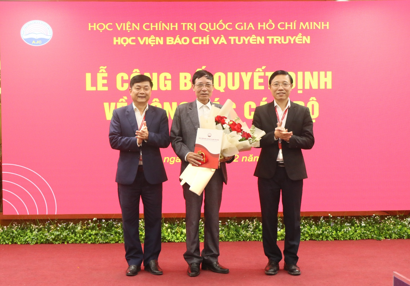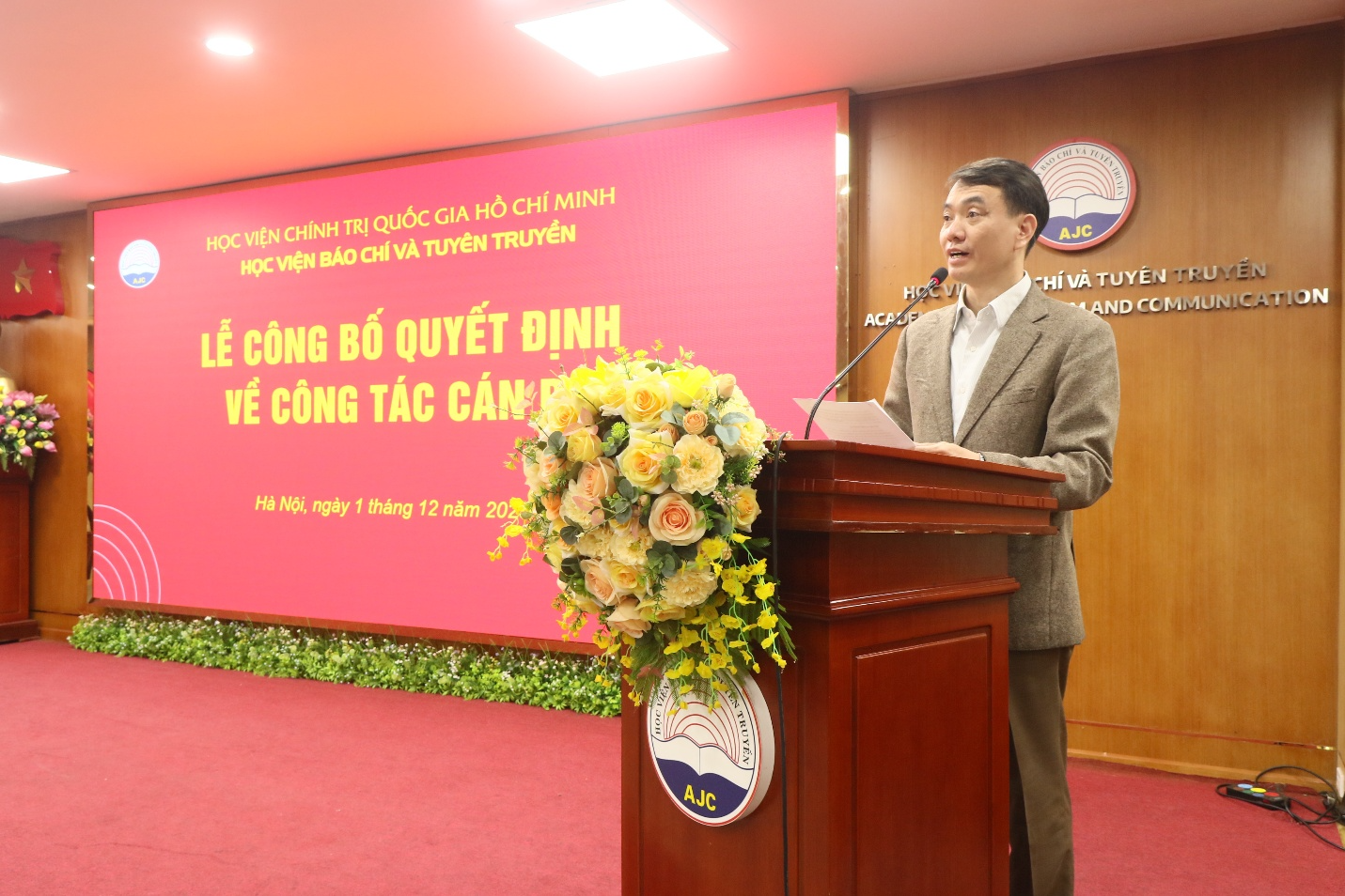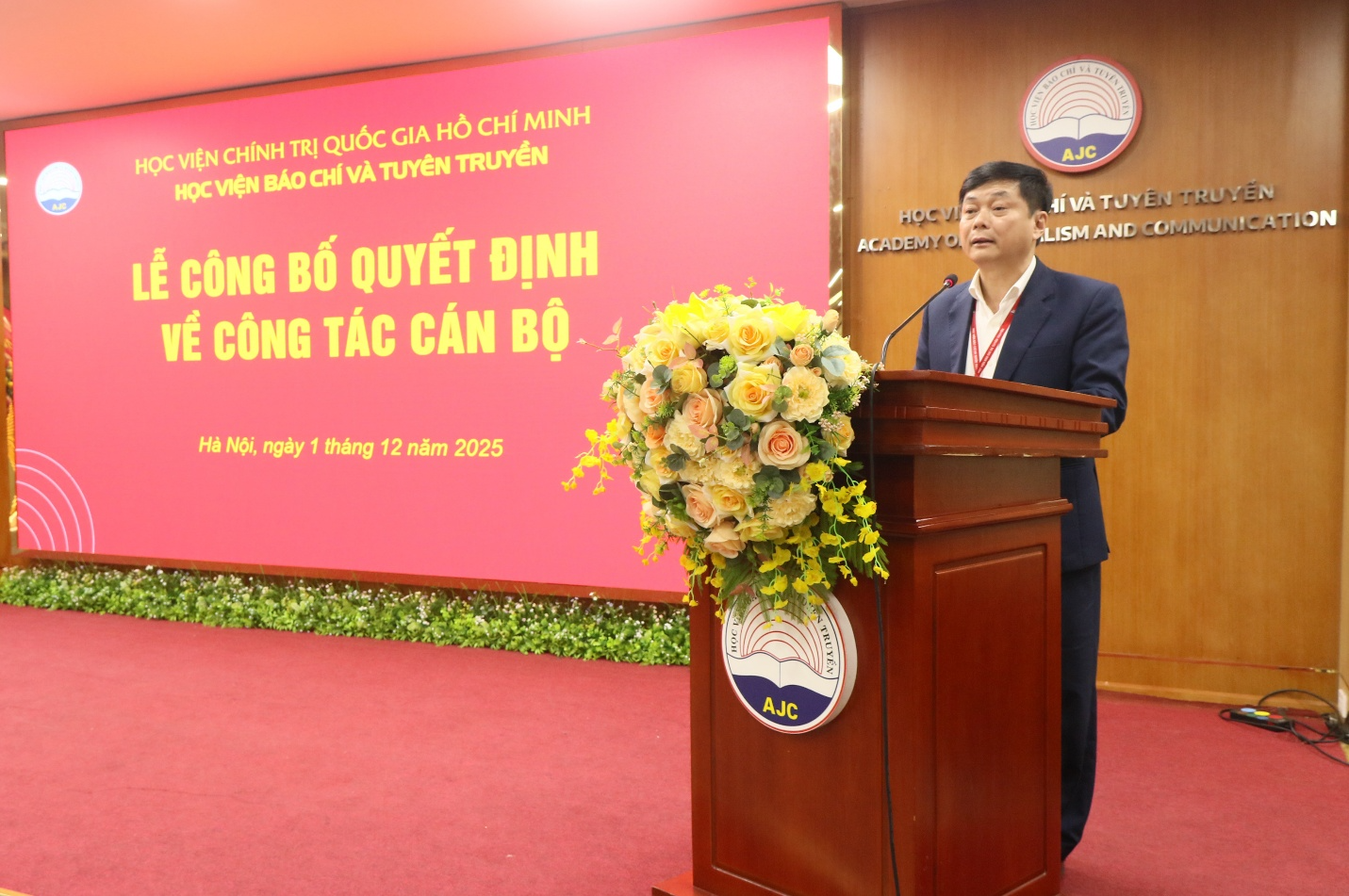Tại buổi Lễ, thừa ủy quyền của Giám đốc Học viện Báo chí và Tuyên truyền, TS. Nguyễn Đình Định, Phó Trưởng Ban Tổ chức cán bộ đã công bố Quyết định bổ nhiệm lại đối với các đồng chíTSLữ Đăng Nhạc giữ chức vụ Phó Trưởng Khoa Giáo dục đại cương và Nghiệp vụ sư phạm từ ngày 15/12/2025, thời hạn giữ chức vụ bổ nhiệm lại là 05 năm; TS. Nguyễn Thị Hương giữ chức vụ Phó Trưởng Khoa Ngoại ngữ từ ngày 15/12/2025, thời hạn giữ chức vụ bổ nhiệm lại là 05 năm; ThS. Nguyễn Viết Sơn giữ chức vụ Phó Giám đốc Trung tâm Khảo thí và Đảm bảo chất lượng đào tạo từ ngày 15/12/2025, thời hạn giữ chức vụ bổ nhiệm lại là 05 năm.