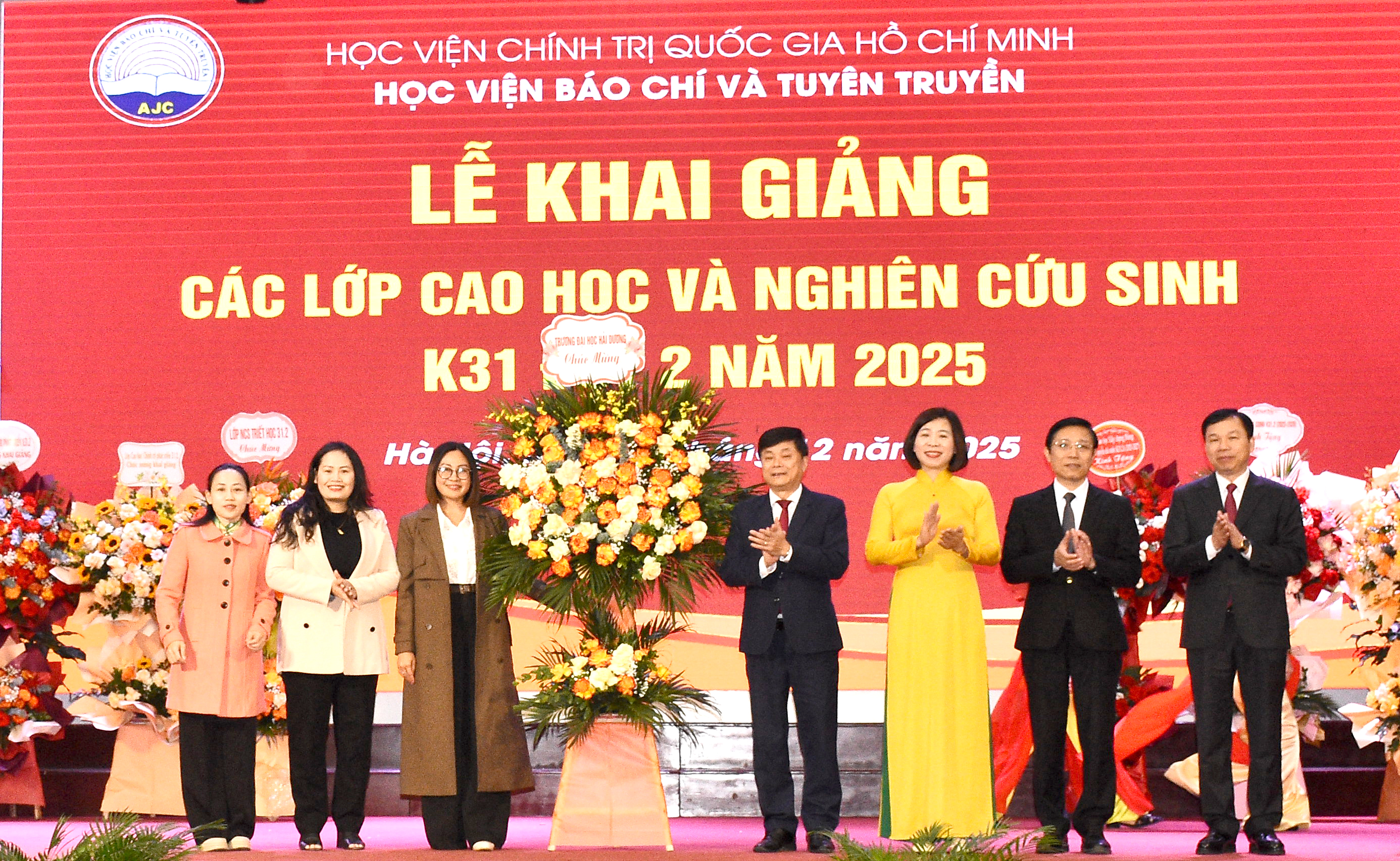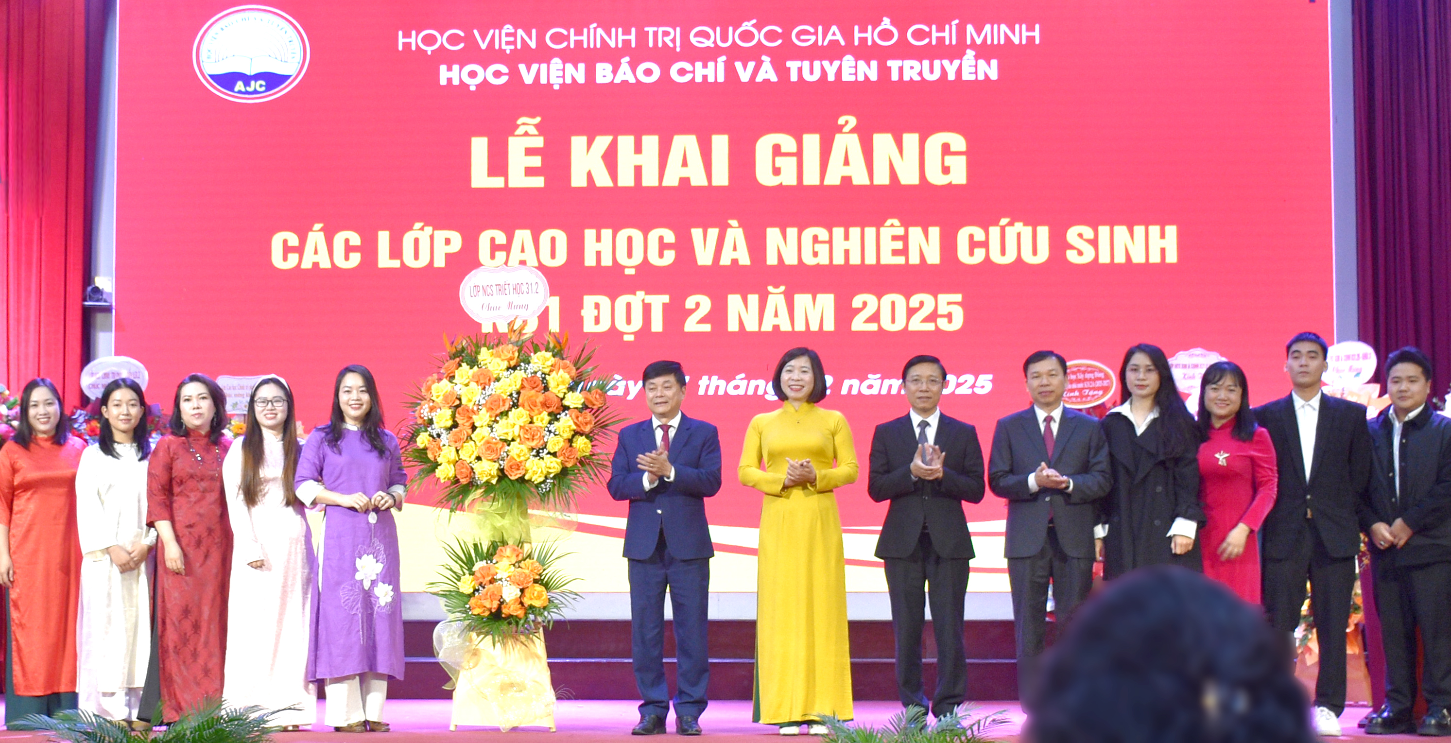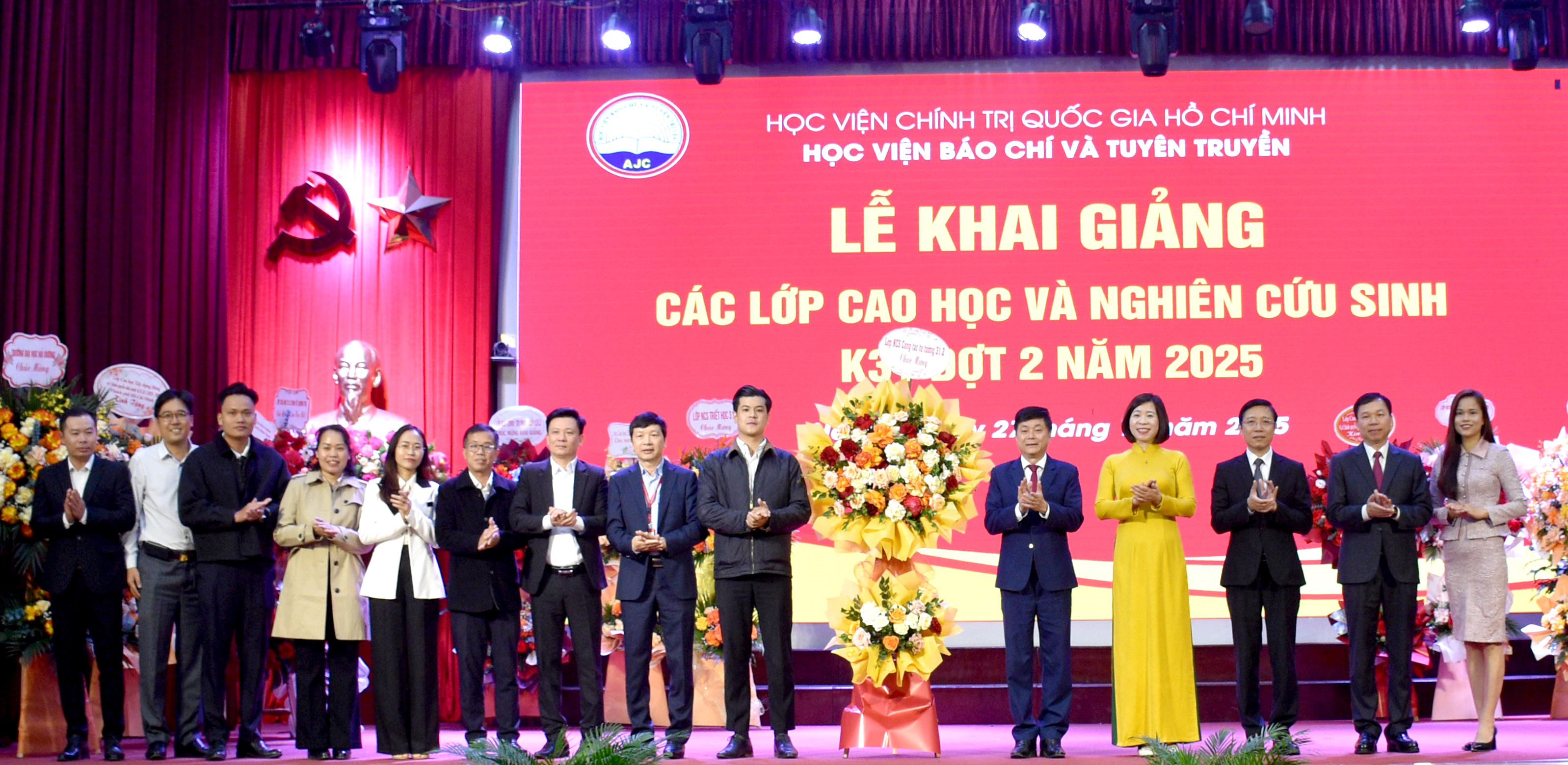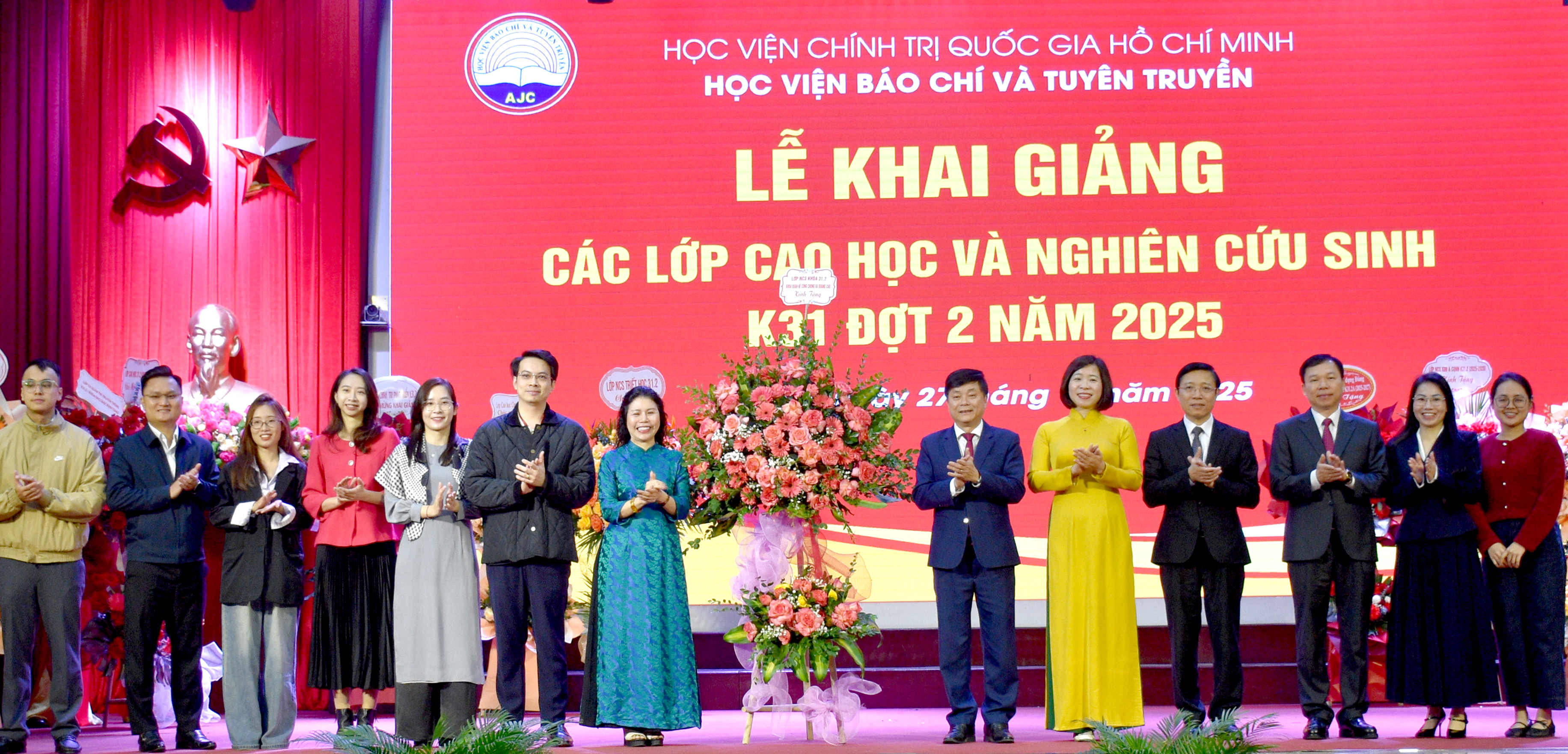 Các đại biểu thực hiện nghi thức chào cờ tại Lễ Khai giảng các lớp Cao học và Nghiên cứu sinh khóa 31 đợt 2 năm 2025 tại Hội trường lớn Học viện Báo chí và Tuyên truyềnPhát biểu khai giảng, PGS, TS. Phạm Minh Sơn, Giám đốc Học viện chúc mừng 424 tân học viên cao học của 15 ngành/chuyên ngành và 104 tân nghiên cứu sinh của 8 ngành/chuyên ngành khóa 31 đợt 2 năm 2025. Đồng chí nhấn mạnh, Lễ Khai giảng là dấu mốc quan trọng, ghi nhận kết quả của một kỳ tuyển sinh nghiêm túc, đúng quy định, mở đầu cho quá trình học tập, nghiên cứu chuyên sâu của các học viên và nghiên cứu sinh khóa mới.