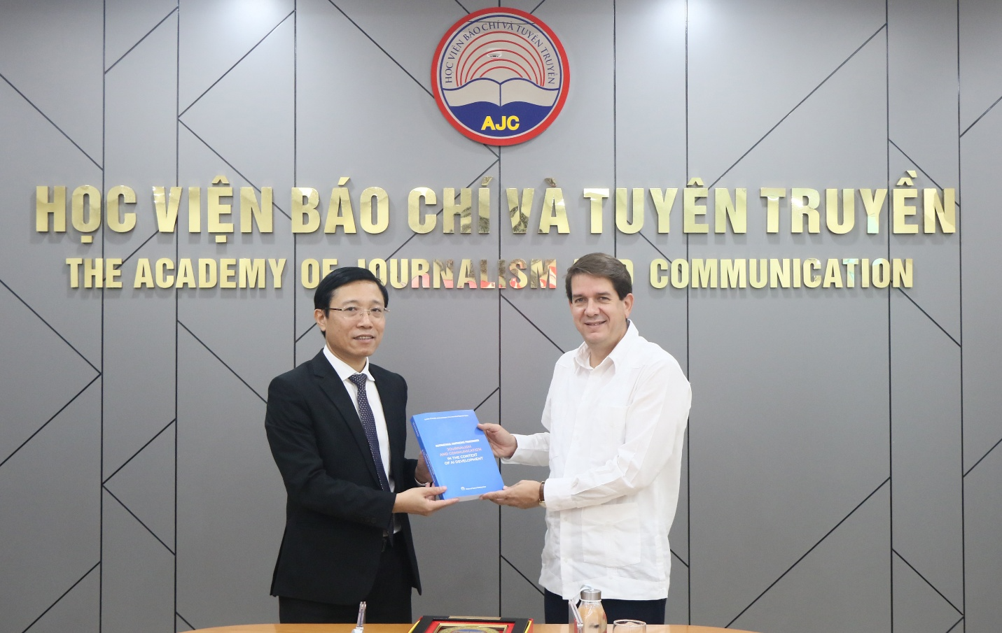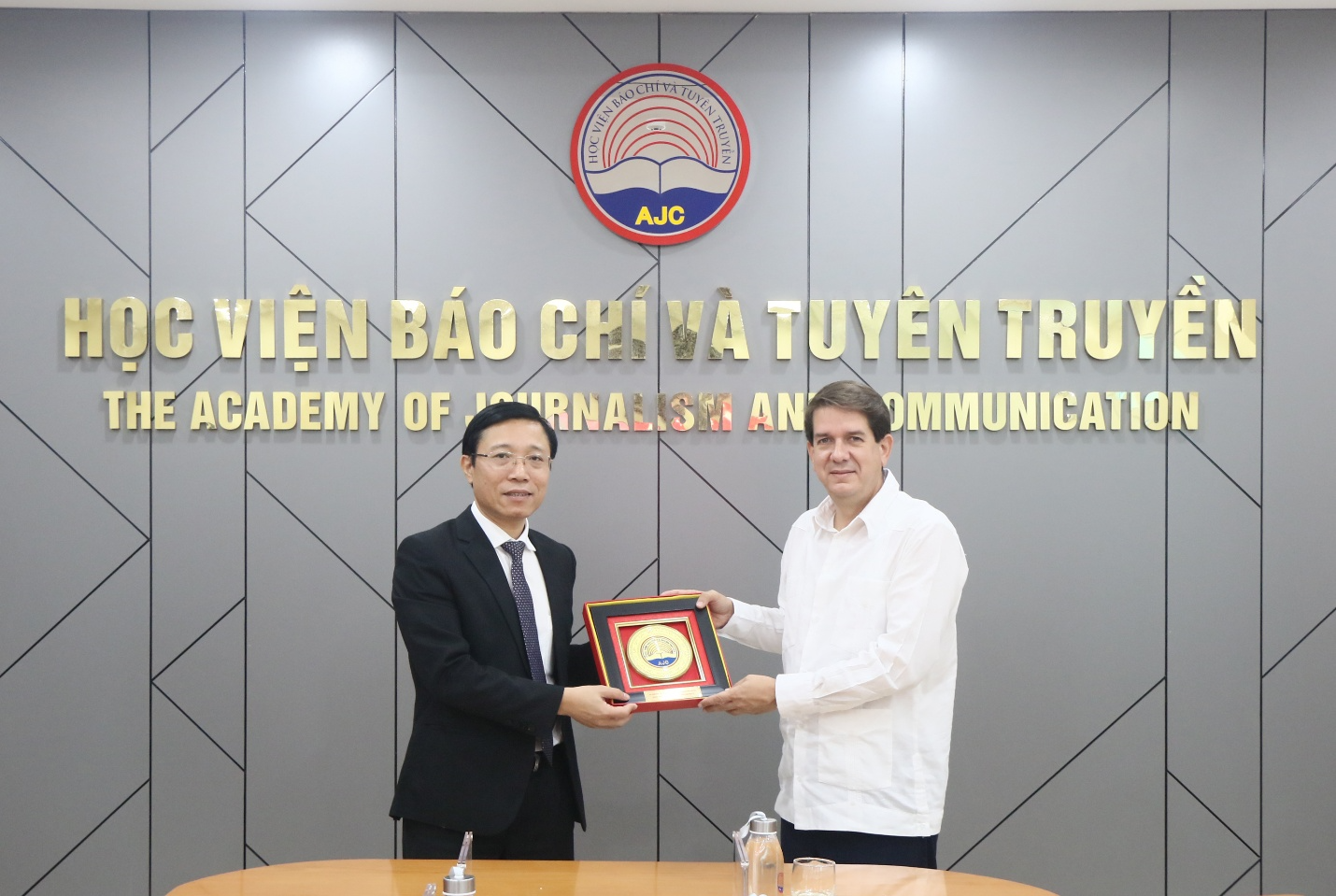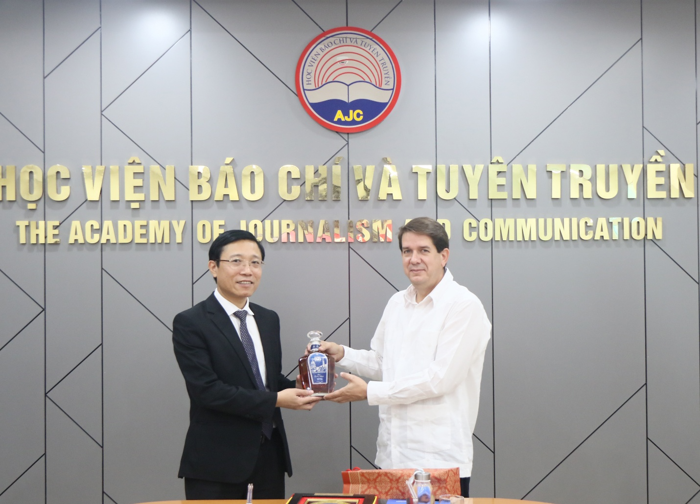 TS. Nguyễn Đức Toàn, Phó Giám đốc Học viện Báo chí và Tuyên truyền tặng quà lưu niệm đồng chí Jorge Legannoa Alonso, Chủ tịch Thông tấn xã Mỹ Latinh (Prensa Latina) Cuba