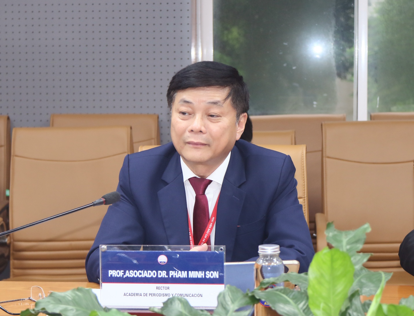 Phát biểu tại buổi làm việc, PGS,TS. Phạm Minh Sơn, Giám đốc Học viện đã giới thiệu khái quát về thế mạnh đào tạo và xu hướng phát triển của Học viện Báo chí và Tuyên truyền. Đồng chí bày tỏ niềm vinh dự khi được đón tiếp Ngài Juan Carlos Fernandes Juárez, Đại sứ đặc mệnh toàn quyền nước Cộng hòa Bolivar Venezuela tại Việt Nam đến thăm, làm việc và giao lưu, chia sẻ với giảng viên, sinh viên Học viện Báo chí và Tuyên truyền.