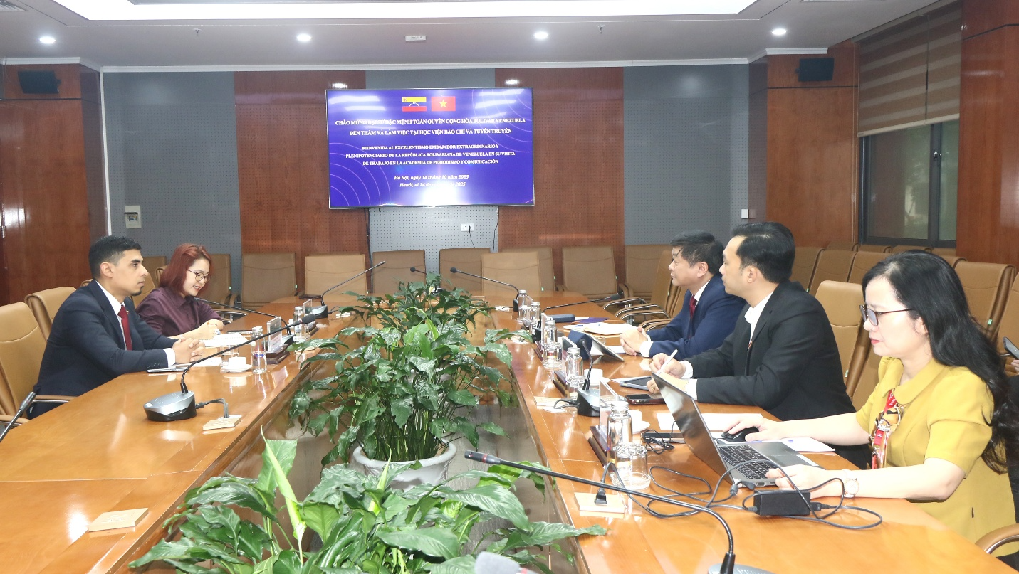 Đồng chí cũng bày tỏ mong muốn được tăng cường hợp tác với các cơ sở giáo dục đại học, viện nghiên cứu của nước Cộng hòa Bolivar Venezuela trên các mặt: trao đổi giảng viên, sinh viên, đặc biệt trong lĩnh vực khoa học chính trị và báo chí - truyền thông; hợp tác tổ chức các hội thảo khoa học, tọa đàm chuyên đề thuộc lĩnh vực lý luận chính trị, báo chí – truyền thông và thông tin đối ngoại, qua đó, tạo không gian học thuật mở, gắn kết giảng viên, sinh viên hai nước.