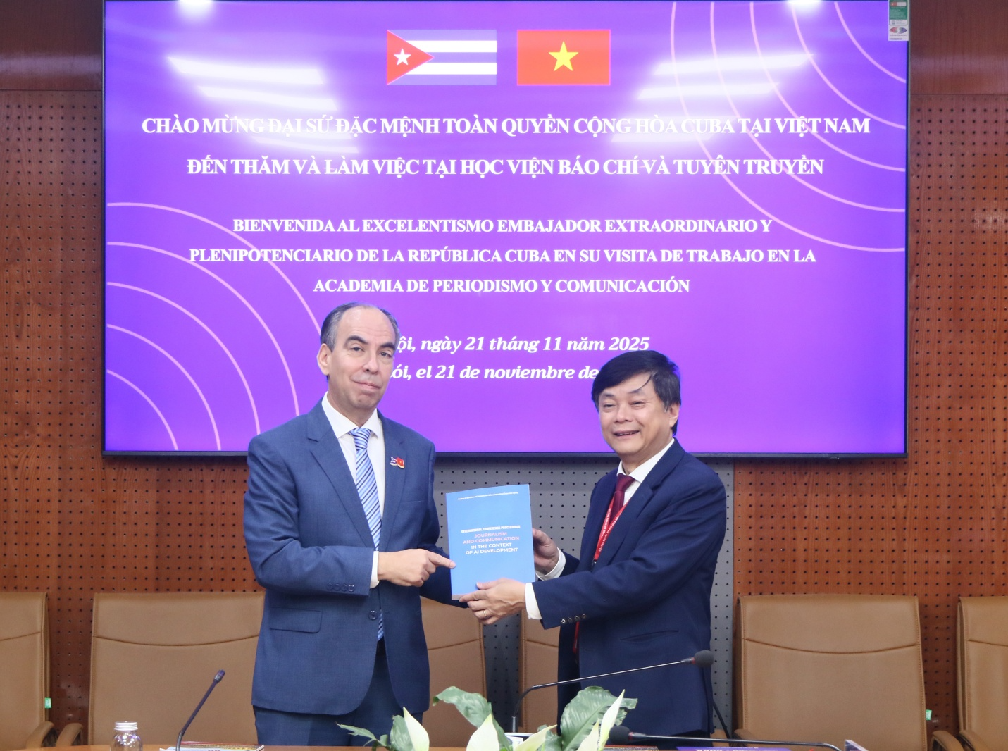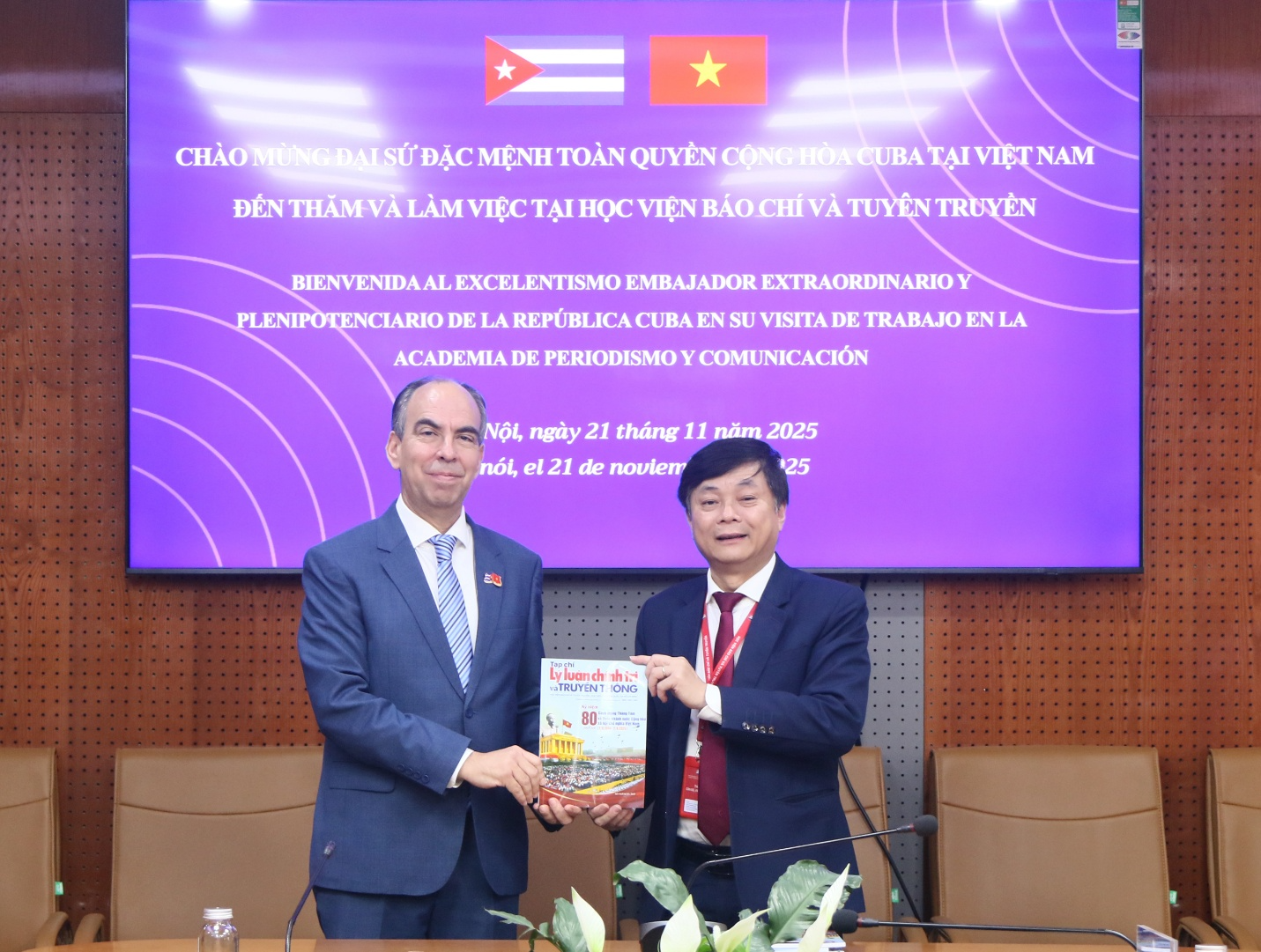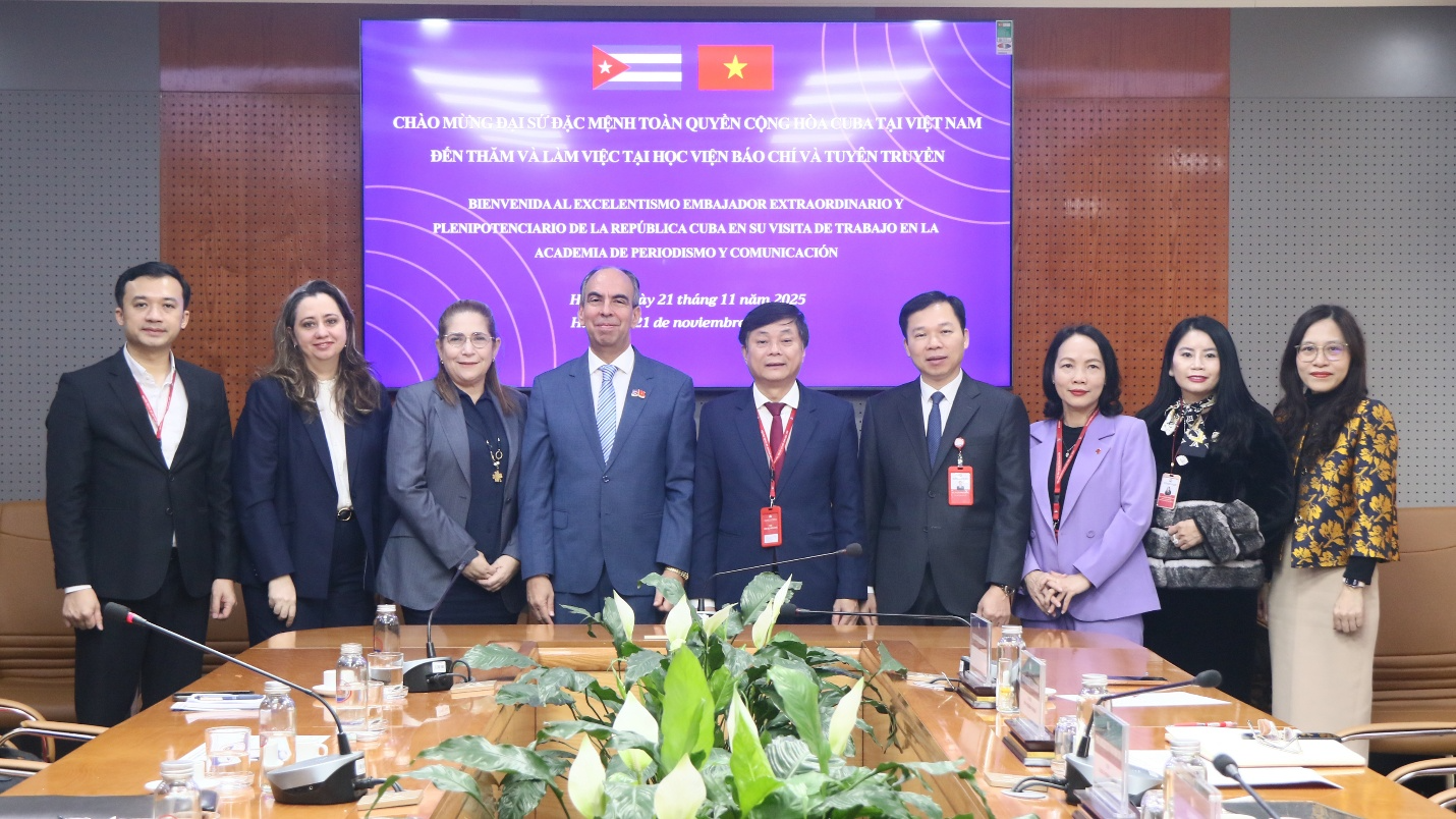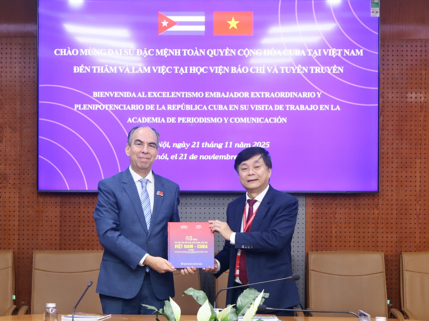 Nhằm mở rộng hoạt động hợp tác với các đối tác thuộc khu vực Mỹ Latinh, sáng 21/11/2025, Học viện Báo chí và Tuyên truyền tiếp và làm việc với Đại sứ đặc mệnh toàn quyền Cộng hòa Cuba tại Việt Nam, ngài Rogelio Polanco Fuentes.