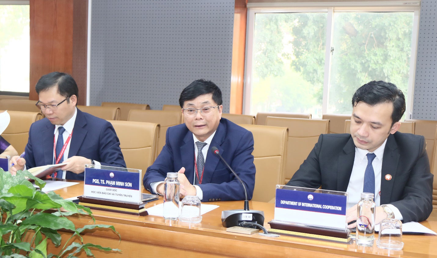 Chủ trì buổi tiếp, về phía Học viện Báo chí và Tuyên truyền có PGS,TS. Phạm Minh Sơn, Giám đốc Học viện. Tham dự có PGS,TS. Lưu Văn Quảng, Phó Giám đốc Học viện; PGS,TS. Phan Minh Đức, Phó Trưởng ban Quản lý khoa học và Hợp tác quốc tế; PGS,TS. Bùi Thị Kim Hậu, Trưởng khoa Chủ nghĩa xã hội khoa học; PGS,TS. Nguyễn Thị Ngọc Hoa, Trưởng khoa Chính trị học; TS. Lưu Thúy Hồng, Phó trưởng khoa Quan hệ quốc tế.