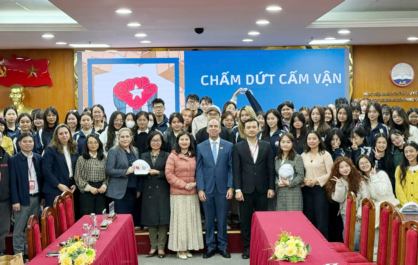 Ngài Rogelio Polanco Fuentes, Đại sứ đặc mệnh toàn quyền Cộng hòa Cuba tại Việt Nam chụp ảnh cùng giảng viên, sinh viên Học viện Báo chí và Tuyên truyền.