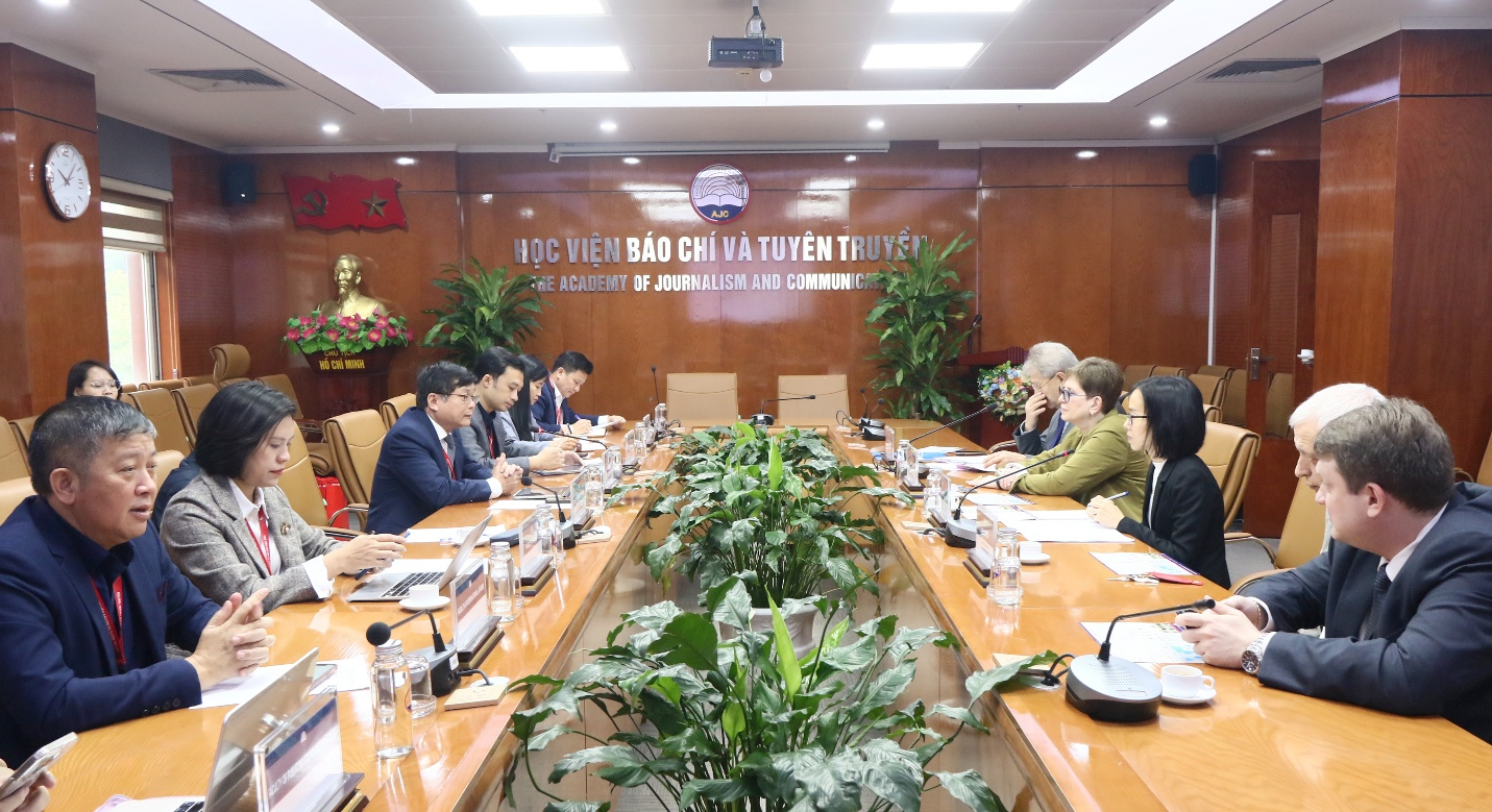 Phát biểu tại buổi làm việc, PGS,TS. Phạm Minh Sơn, Giám đốc Học viện bày tỏ vui mừng được đón tiếp Đoàn chuyên gia của Viện Nghệ thuật đương đại, Liên bang Nga đến thăm và làm việc tại Học viện Báo chí và Tuyên truyền. Đồng chí nhấn mạnh, buổi gặp gỡ có ý nghĩa đặc biệt vì diễn ra đúng dịp kỷ niệm 75 năm thiết lập quan hệ ngoại giao Việt Nam – Liên bang Nga (1950–2025) - một dấu mốc quan trọng trong lịch sử quan hệ song phương, minh chứng cho tình cảm thủy chung, gắn bó giữa hai dân tộc. Nhiều sinh viên, nghiên cứu sinh Việt Nam đã từng học tập tại các trường đại học của Nga và nay là cầu nối cho mối quan hệ hữu nghị giữa hai đất nước và hai dân tộc.