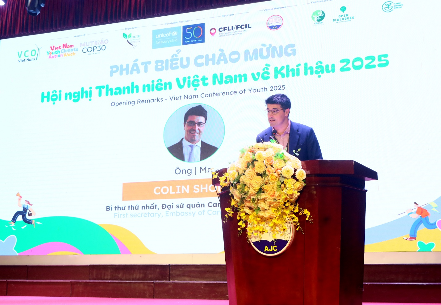 Phát biểu chào mừng Hội nghị, ông Colin Shonk, Bí thư thứ nhất, Đại sứ quán Canada tại Việt Nam nhấn mạnh, thanh niên không chỉ được hưởng lợi từ các chính sách khí hậu mà còn là những người đóng góp và ra quyết định tích cực. Năng lượng, sự sáng tạo và tinh thần sẵn sàng thách thức hiện trạng của thanh niên là yếu tố then chốt để xây dựng một tương lai bền vững và kiên cường cho Việt Nam và hành tinh. Hội nghị mang đến một cơ hội đối thoại quý giá – nơi thanh niên, đại diện chính phủ, các tổ chức quốc tế có thể cùng nhau trao đổi kinh nghiệm và ý tưởng về việc thúc đẩy quản trị khí hậu.