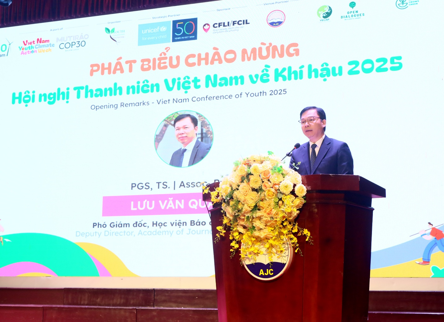 Phát biểu chào mừng Hội nghị, PGS,TS. Lưu Văn Quảng, Phó Giám đốc, Học viện Báo chí và Tuyên truyền nhấn mạnh, Học viện Báo chí và Tuyên truyền luôn coi chủ đề biến đổi khí hậu không chỉ là một nội dung thời sự, mà còn là một sứ mệnh truyền thông xã hội mang tính nhân văn sâu sắc mang lại lợi ích to lớn trong cộng đồng. Học viện luôn coi trọng việc giáo dục ý thức phát triển bền vững, trách nhiệm môi trường và năng lực truyền thông biến đổi khí hậu cho sinh viên.