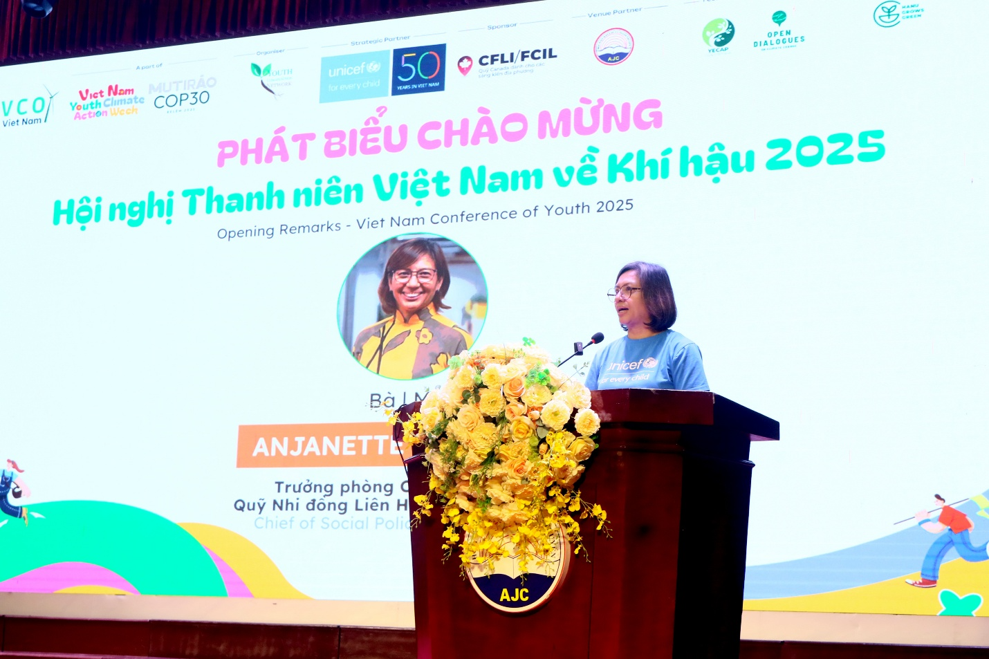 Phát biểu chào mừng Hội nghị, bà Anjanette Saguisag, Trưởng phòng Chính sách Xã hội, Quỹ Nhi đồng Liên hợp quốc tại Việt Nam (UNICEF Việt Nam) nhấn mạnh, những cú sốc khí hậu đang ngày càng trở nên dữ dội hơn, ảnh hưởng rất lớn đến điều kiện học tập, sự phát triển của thanh thiếu niên, và ảnh hưởng đến tương lai của thanh thiếu niên – những người dễ bị tổn thương.