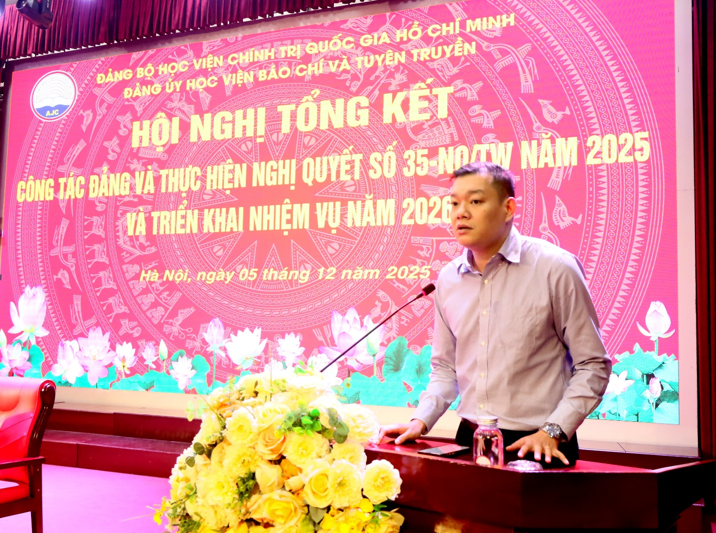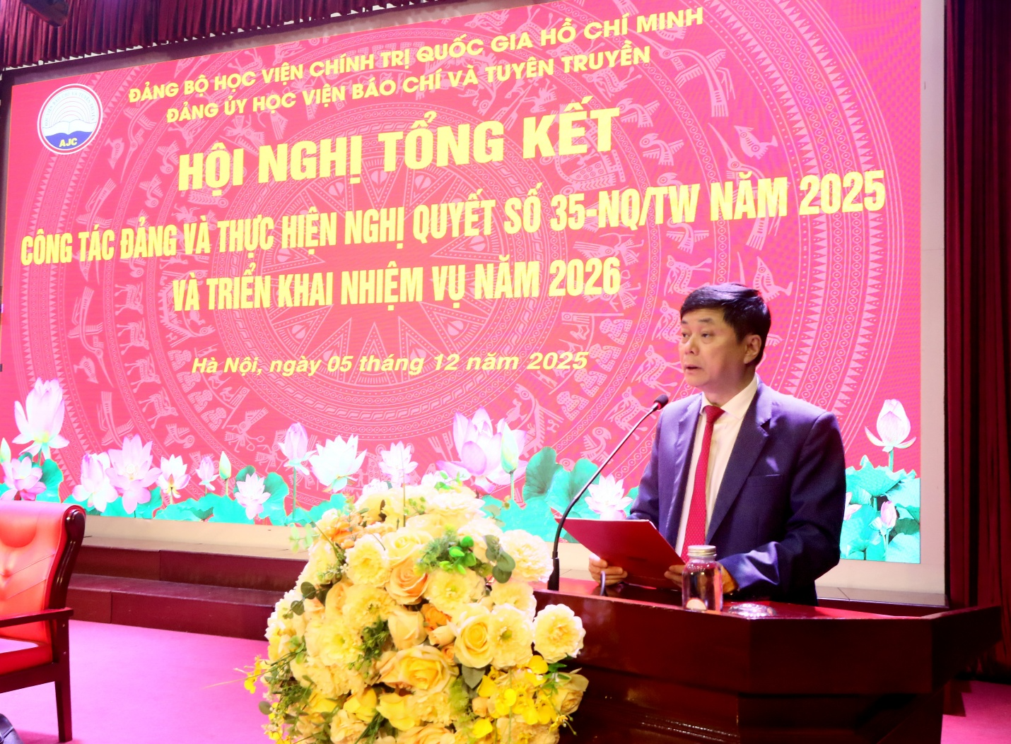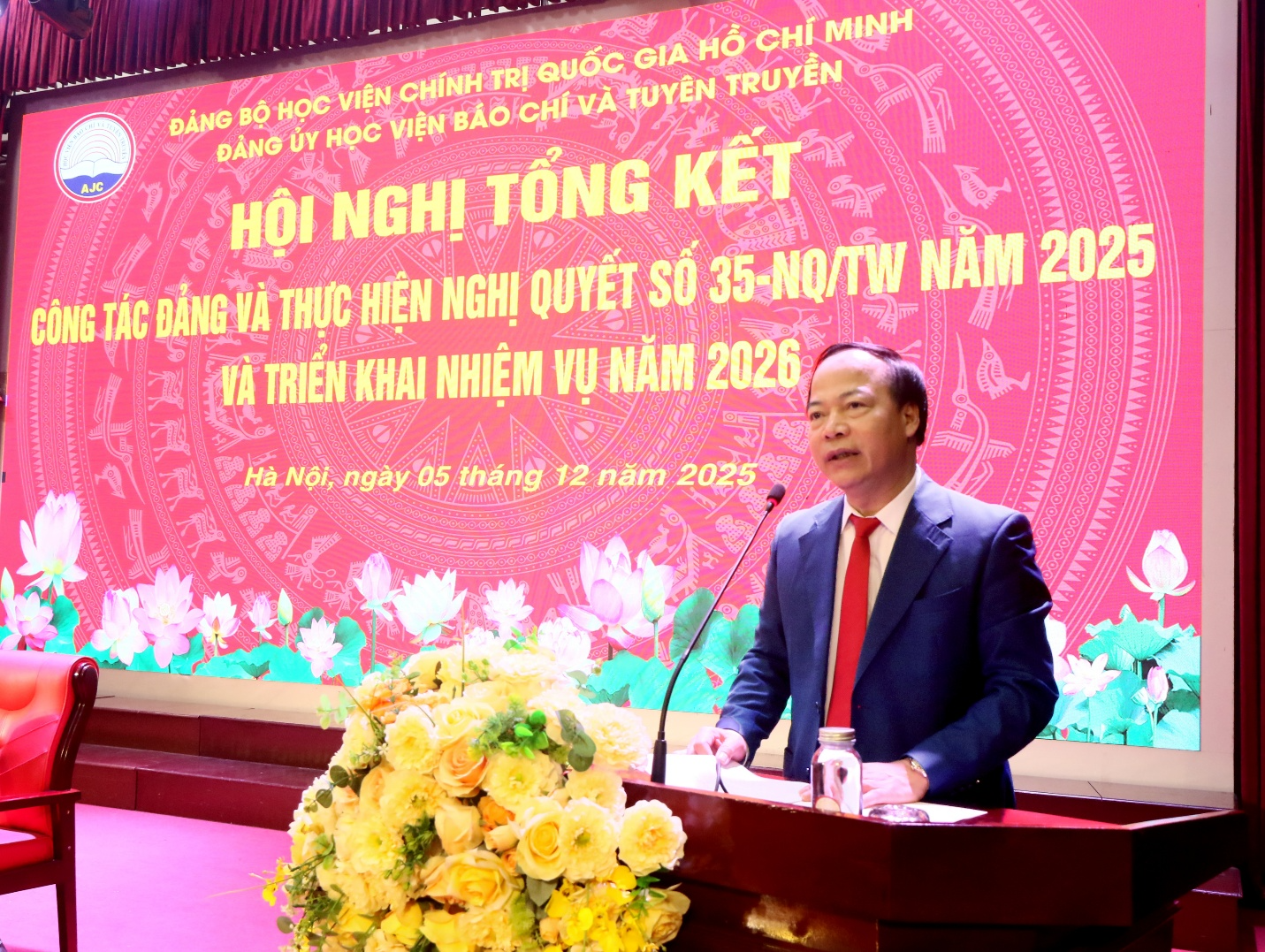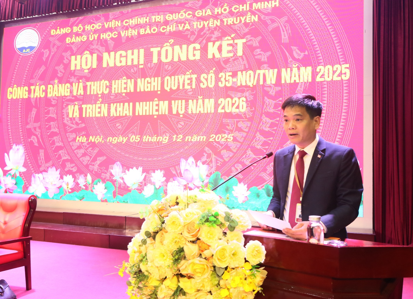 Tại Hội nghị, đồng chí Mai Đức Ngọc, Bí thư Đảng ủy, Chủ tịch Hội đồng trường, Trưởng Ban Chỉ đạo 35 Học viện Báo chí và Tuyên truyền đã trình bày tóm tắt Dự thảo Báo cáo công tác thực hiện Nghị quyết số 35-NQTW năm 2025 và triển khai nhiệm vụ năm 2026.