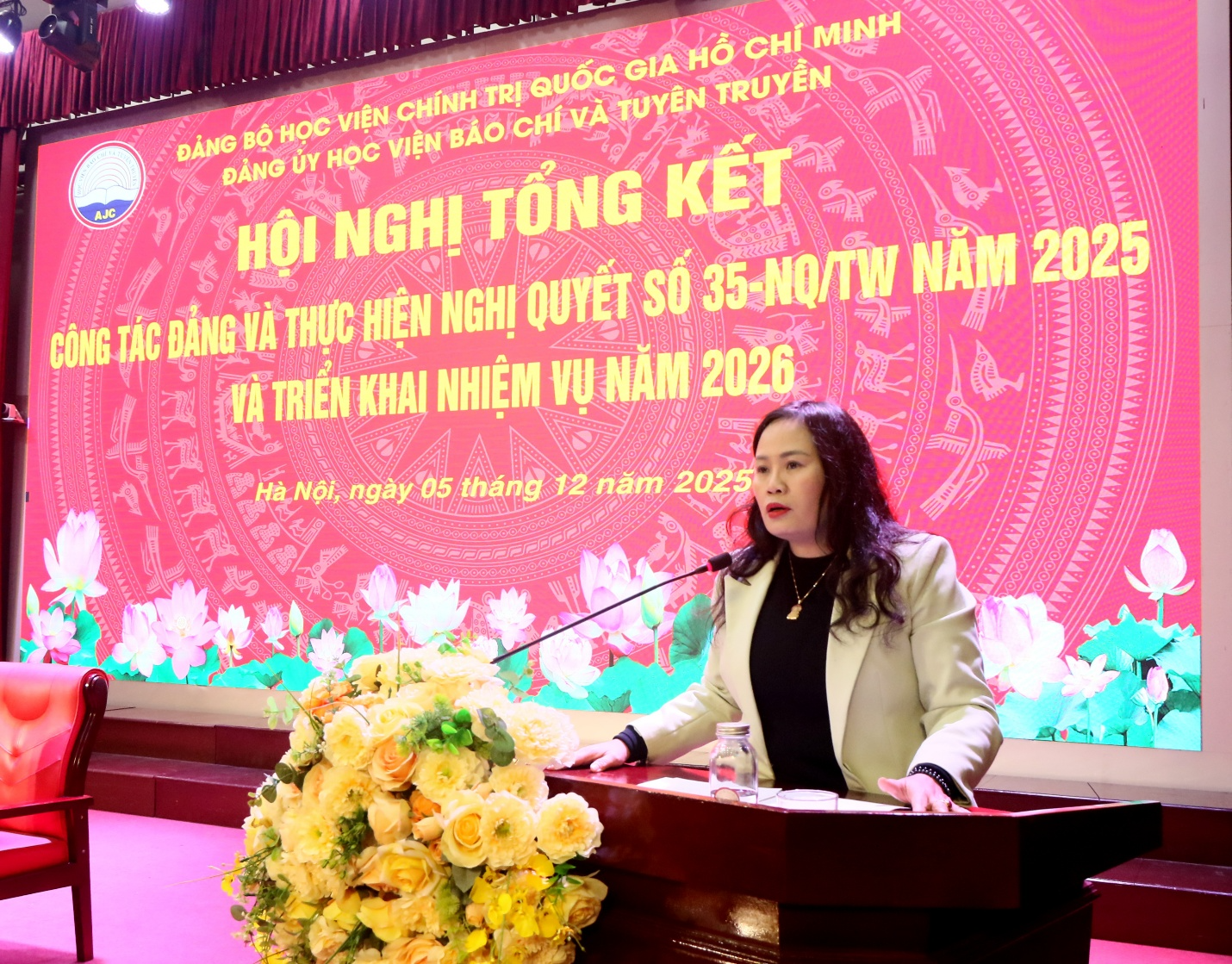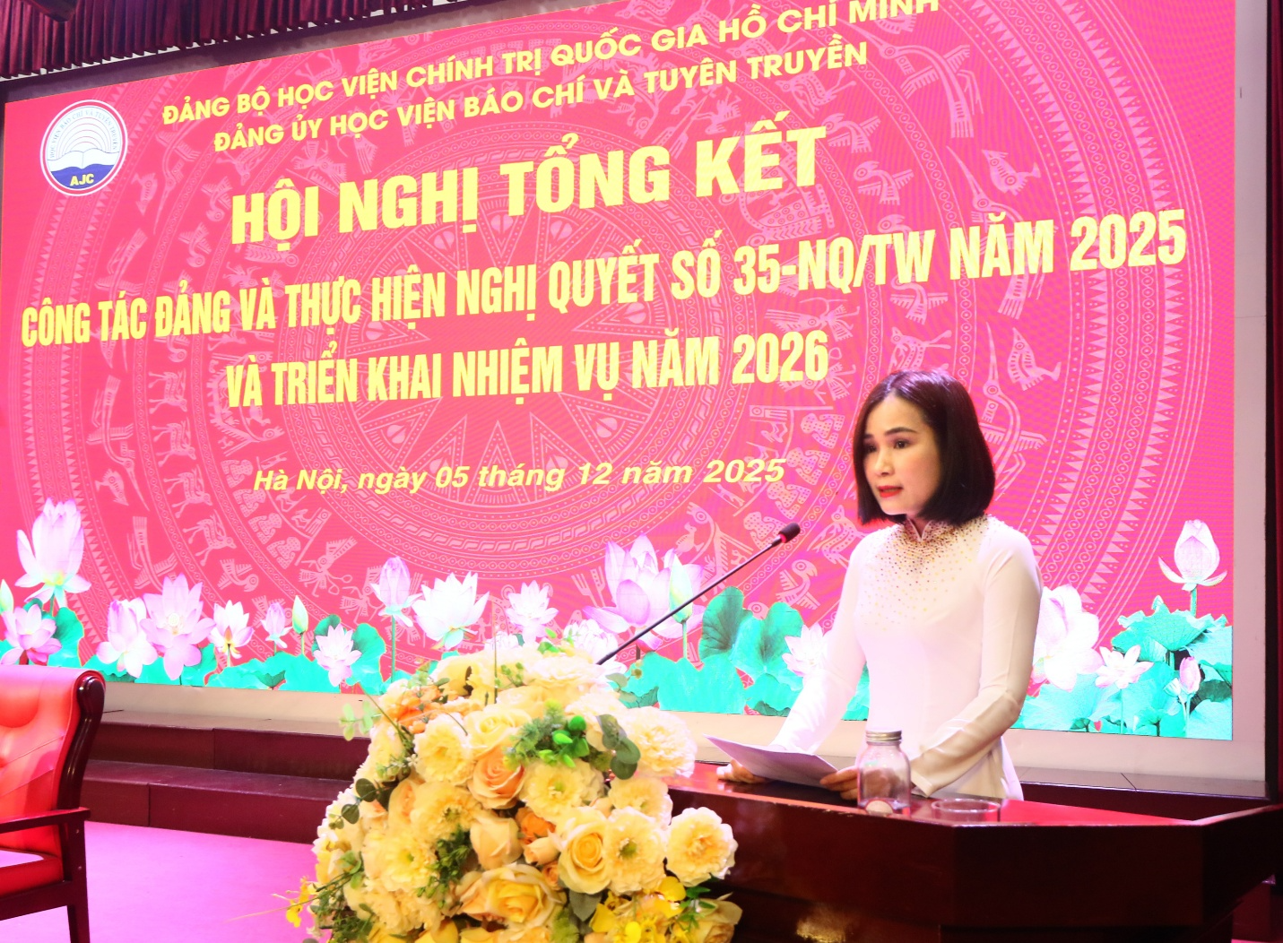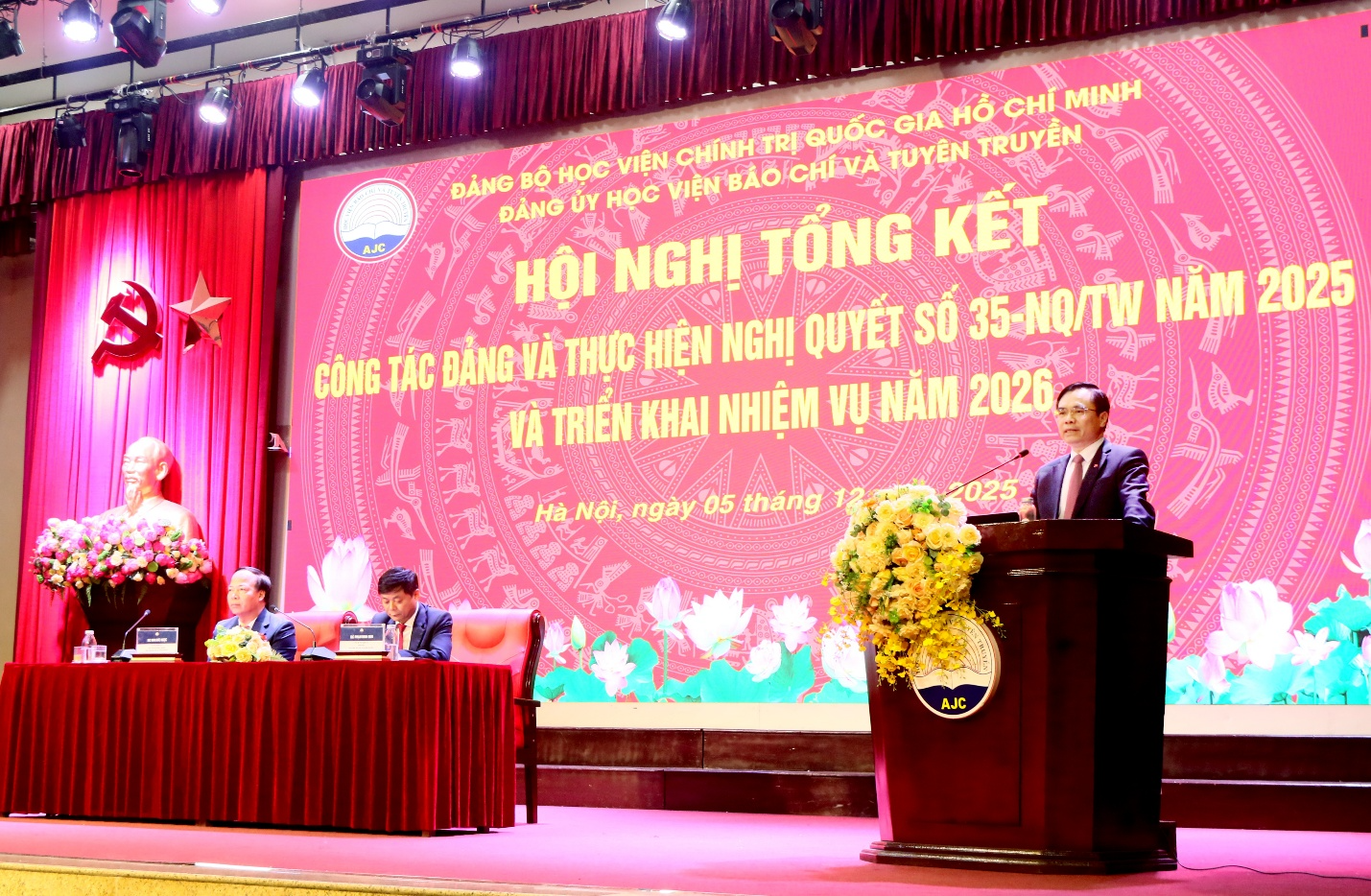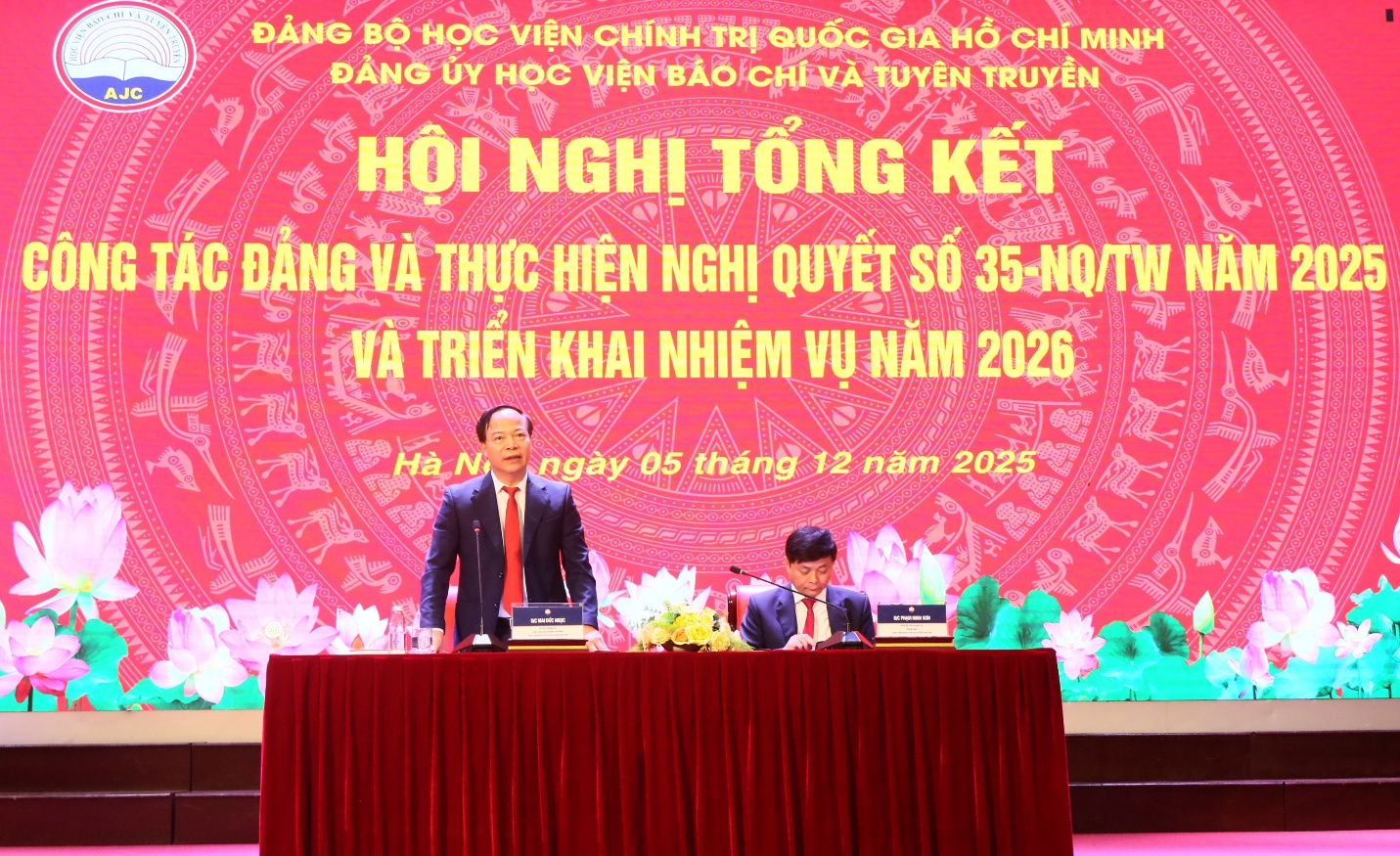 Tại Hội nghị, đồng chí Mai Đức Ngọc, Bí thư Đảng ủy, Chủ tịch Hội đồng trường, Trưởng Ban Chỉ đạo 35 Học viện Báo chí và Tuyên truyền đã trình bày tóm tắt Dự thảo Báo cáo công tác thực hiện Nghị quyết số 35-NQTW năm 2025 và triển khai nhiệm vụ năm 2026.
