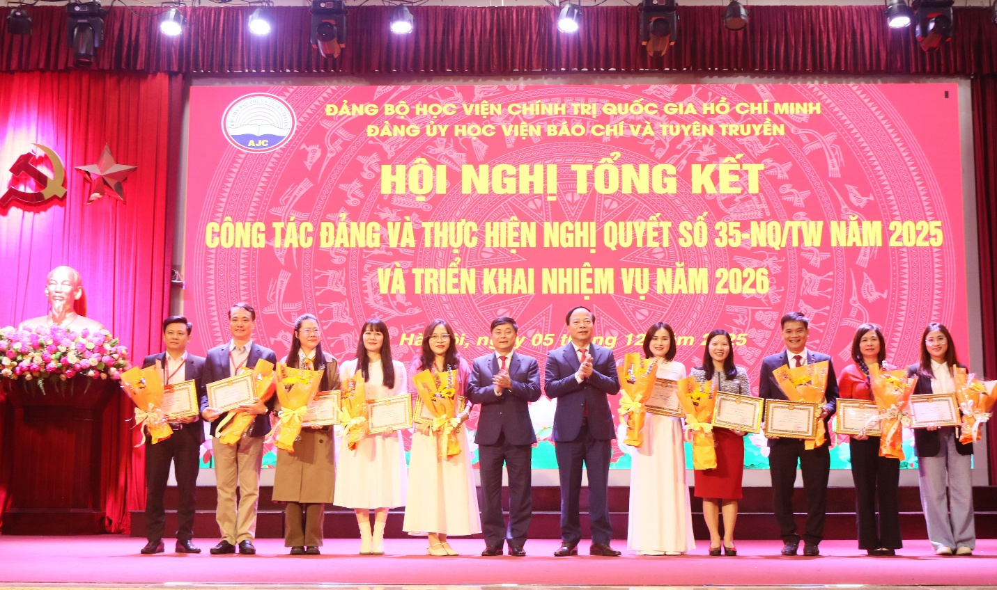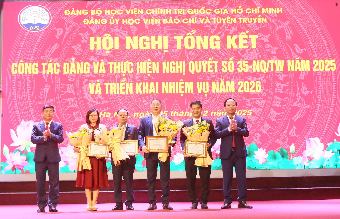 Đồng chí Mai Đức Ngọc, Bí thư Đảng ủy, Chủ tịch Hội đồng trường và đồng chí Phạm Minh Sơn, Phó Bí thư Đảng ủy, Giám đốc Học viện trao tặng Giấy khen của Đảng ủy Học viện Báo chí và Tuyên truyền cho các tập thể đạt danh hiệu Chi bộ Hoàn thành xuất sắc nhiệm vụ năm 2025