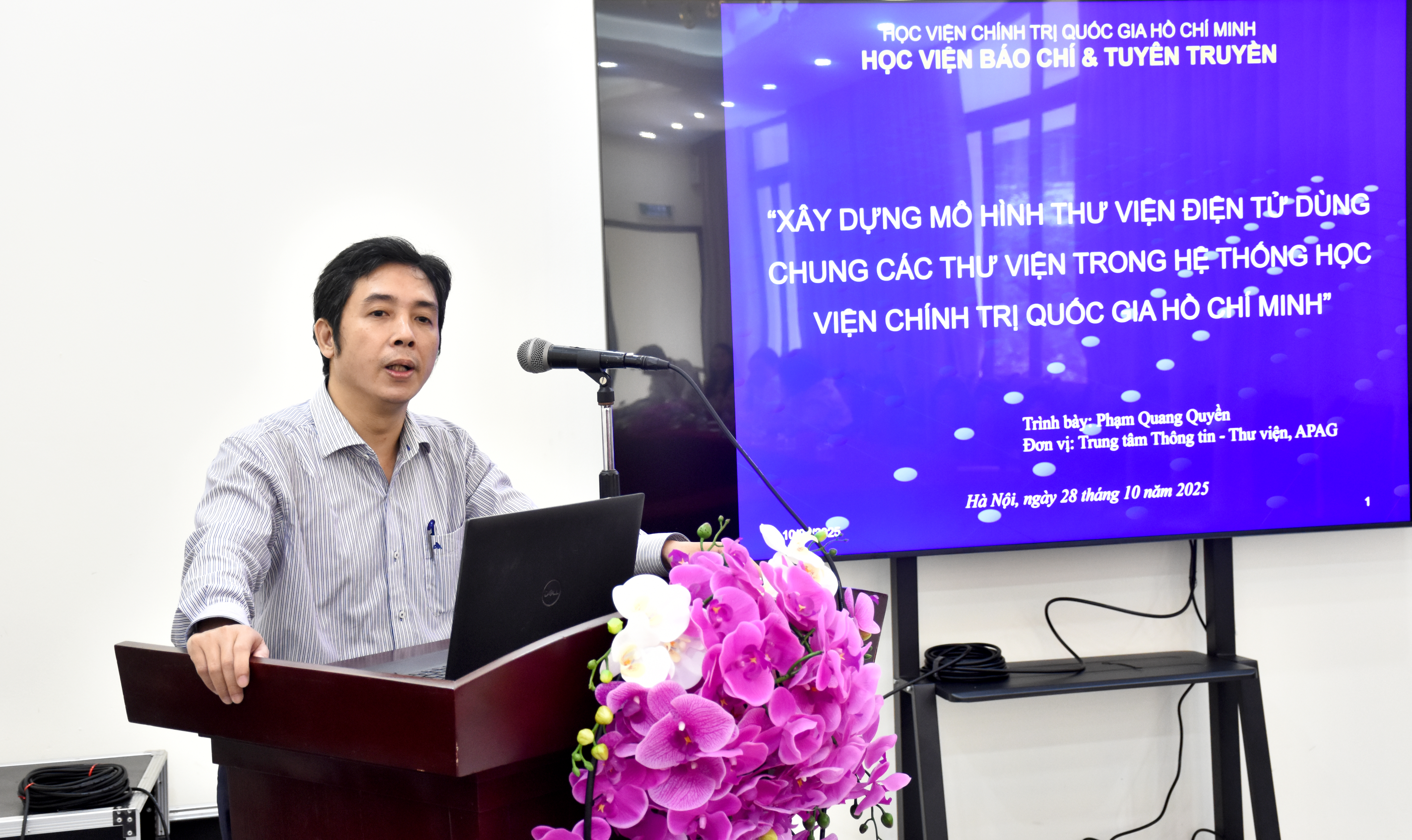 TS. Phạm Quang Quyền, Quyền Giám đốc Trung tâm Thông tin - Thư viện, Học viện Hành chính và Quản trị công trình bày tham luận Xây dựng mô hình thư viện điện tử dùng chung giữa các thư viện trong hệ thống Học viện Chính trị quốc gia Hồ Chí Minh