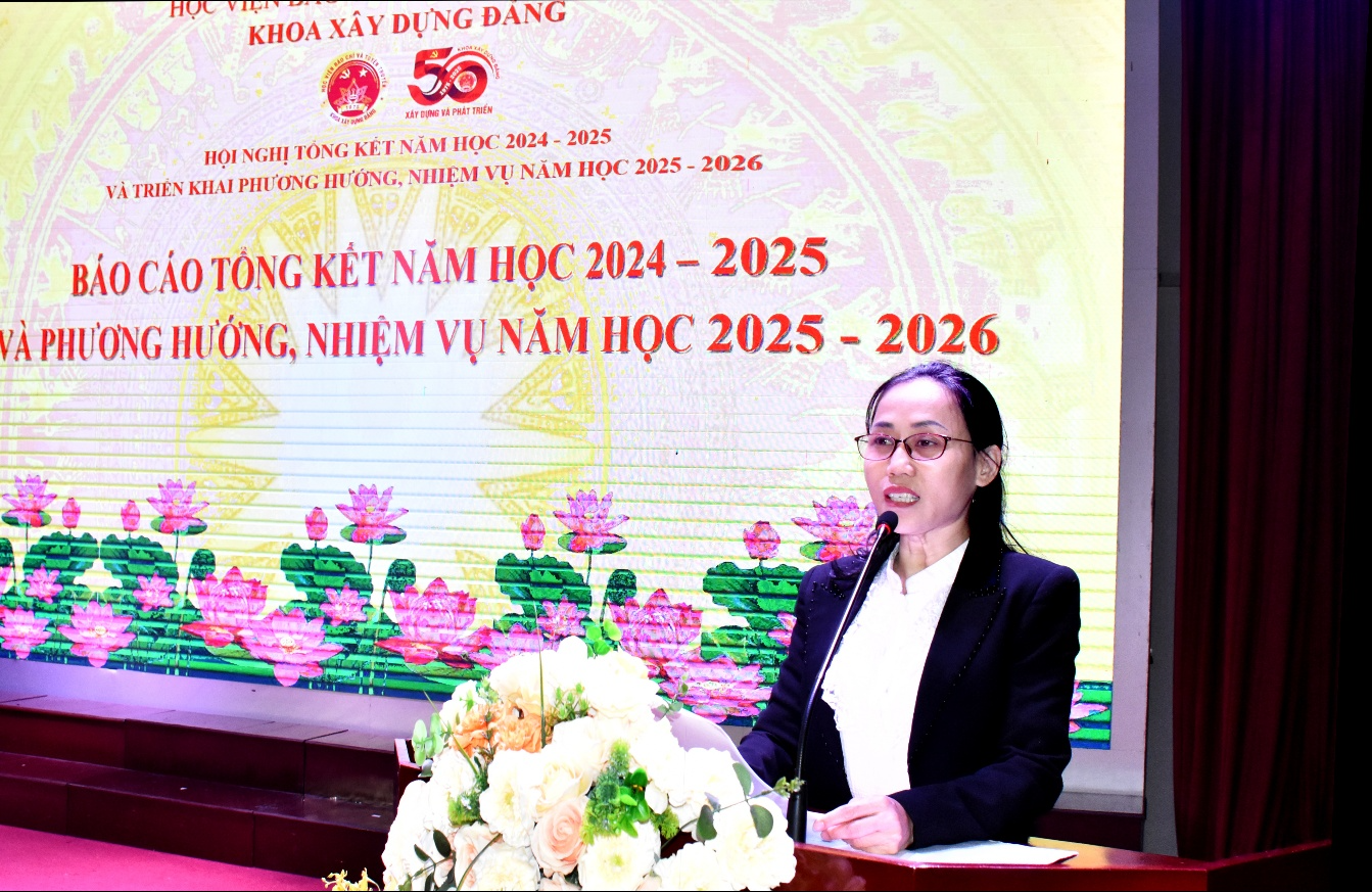 TS. Nguyễn Thị Thu Thủy, Phó Trưởng khoa Xây dựng Đảng trình bày báo cáo tổng kết năm học 2024 - 2025 và phương hướng, nhiệm vụ năm học 2025 - 2026