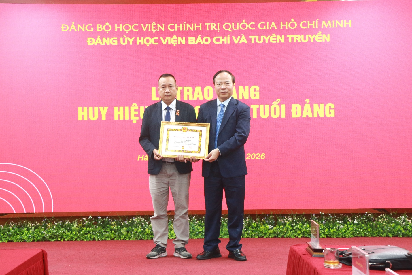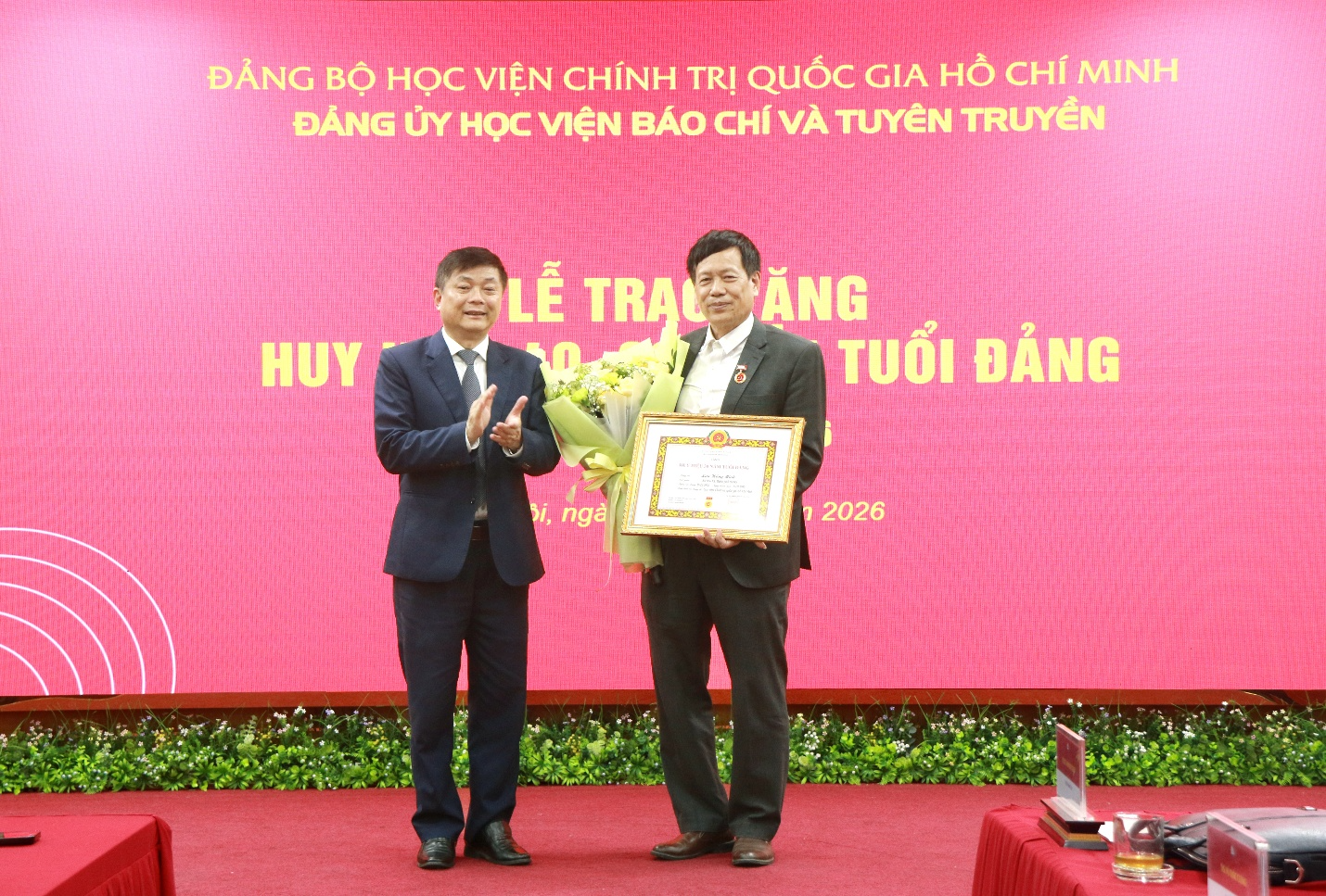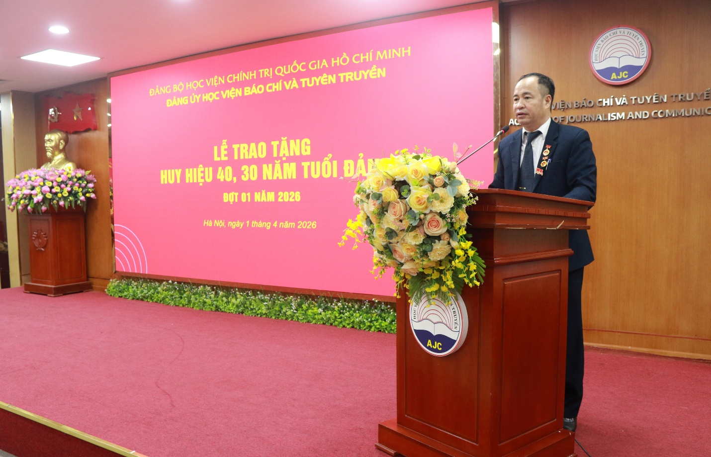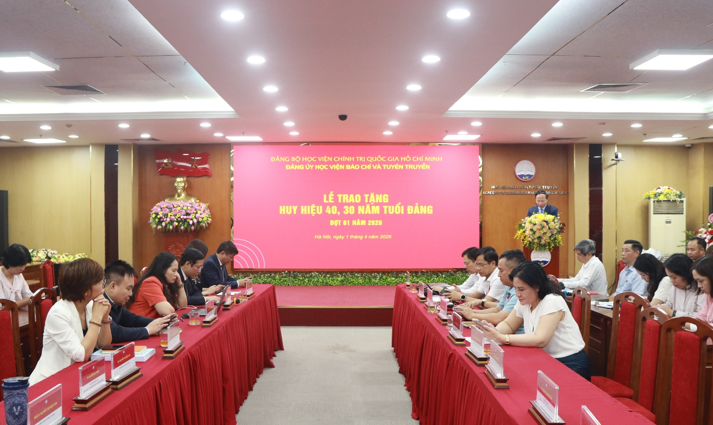 Sáng 01/4/2026, Đảng ủy Học viện Báo chí và Tuyên truyền trang trọng tổ chức Lễ trao tặng Huy hiệu 40 năm tuổi Đảng cho đồng chí đồng chí Lê Khánh Lộc, Phó Chánh Văn phòng Học viện; Huy hiệu 30 năm tuổi Đảng cho đồng chí Lưu Hồng Minh, nguyên Trưởng khoa Xã hội học và Phát triển, đồng chí Ngô Đức Phương, chuyên viên Ban Quản lý đào tạo, bồi dưỡng.