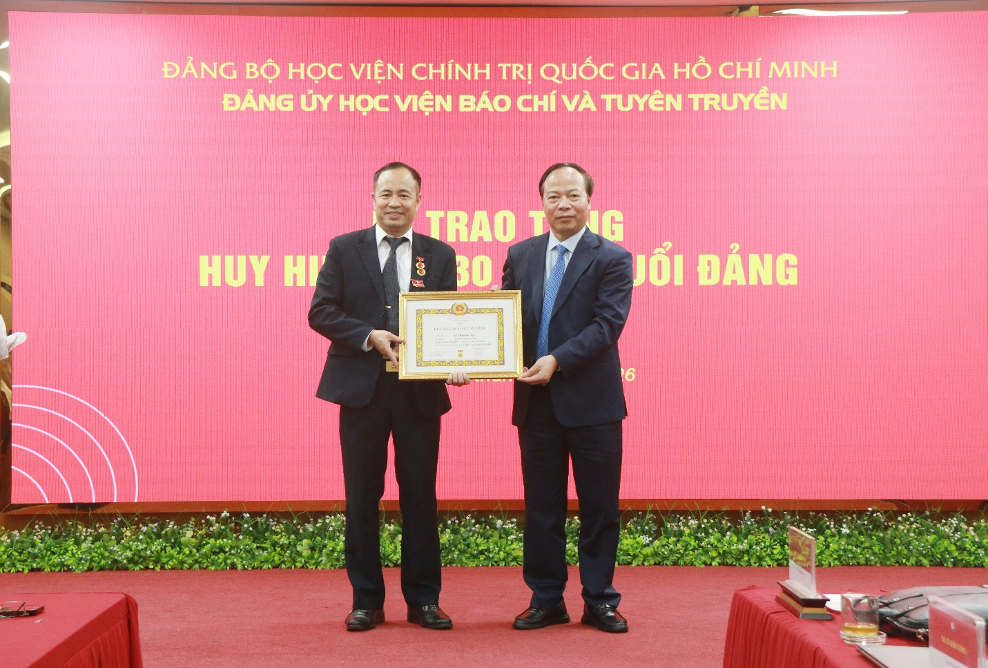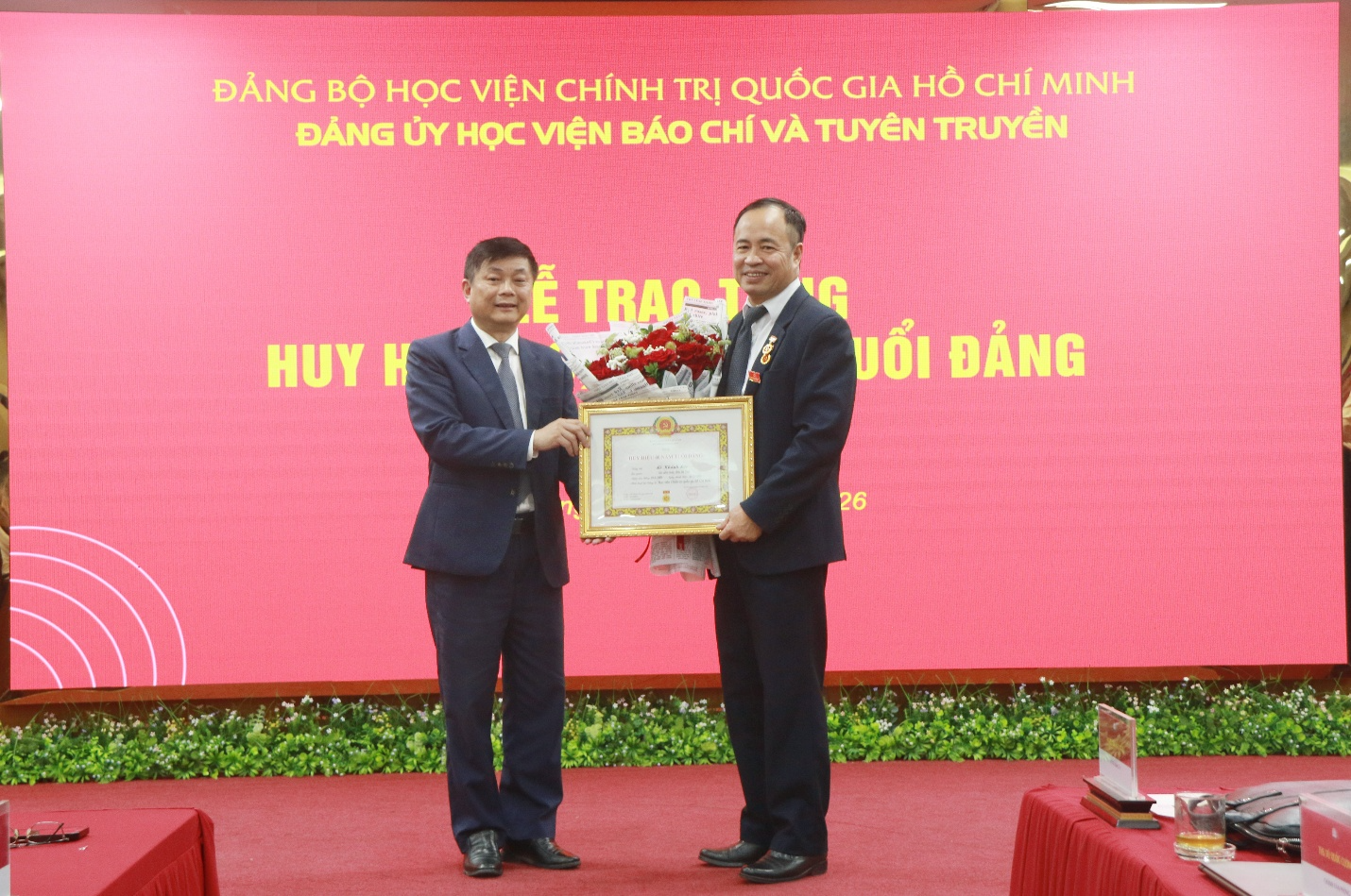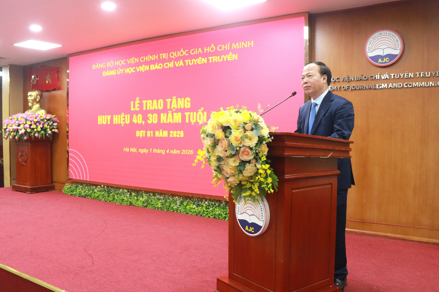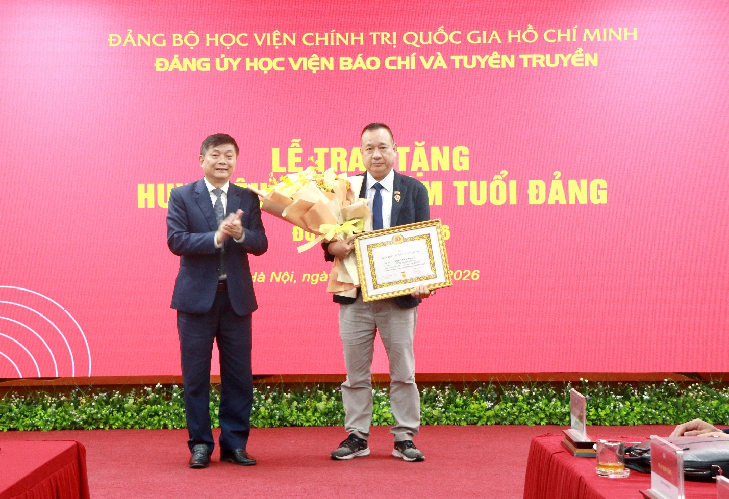 Sáng 01/4/2026, Đảng ủy Học viện Báo chí và Tuyên truyền trang trọng tổ chức Lễ trao tặng Huy hiệu 40 năm tuổi Đảng cho đồng chí đồng chí Lê Khánh Lộc, Phó Chánh Văn phòng Học viện; Huy hiệu 30 năm tuổi Đảng cho đồng chí Lưu Hồng Minh, nguyên Trưởng khoa Xã hội học và Phát triển, đồng chí Ngô Đức Phương, chuyên viên Ban Quản lý đào tạo, bồi dưỡng.
