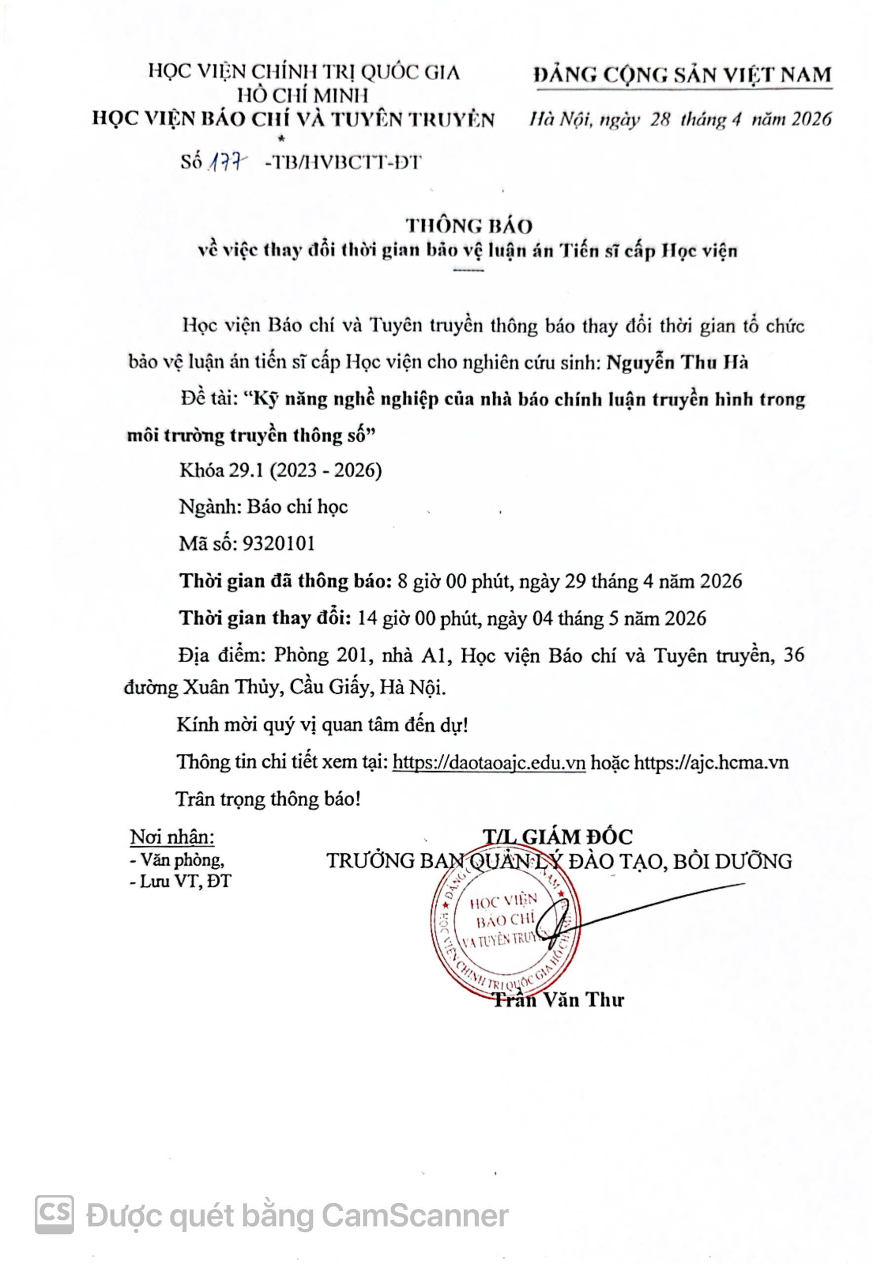 Thông báo thay đổi lịch bảo vệ luận án tiến sĩ cấp Học viện của nghiên cứu sinh Nguyễn Thu Hà