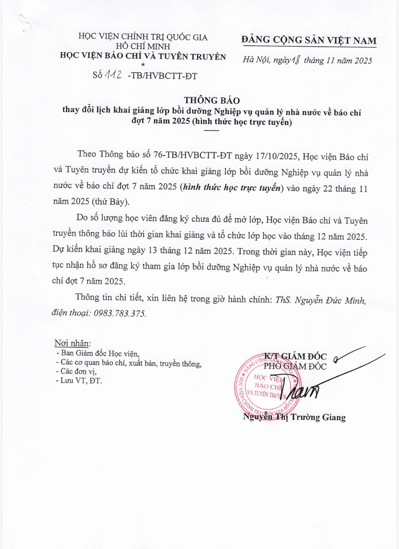Học viện Báo chí và Tuyên truyền thông báo thay đổi lịch khai giảng lớp bồi dưỡng Nghiệp vụ quản lý nhà nước về báo chí đợt 7 năm 2025 (hình thức học trực tuyến) cụ thể như sau: