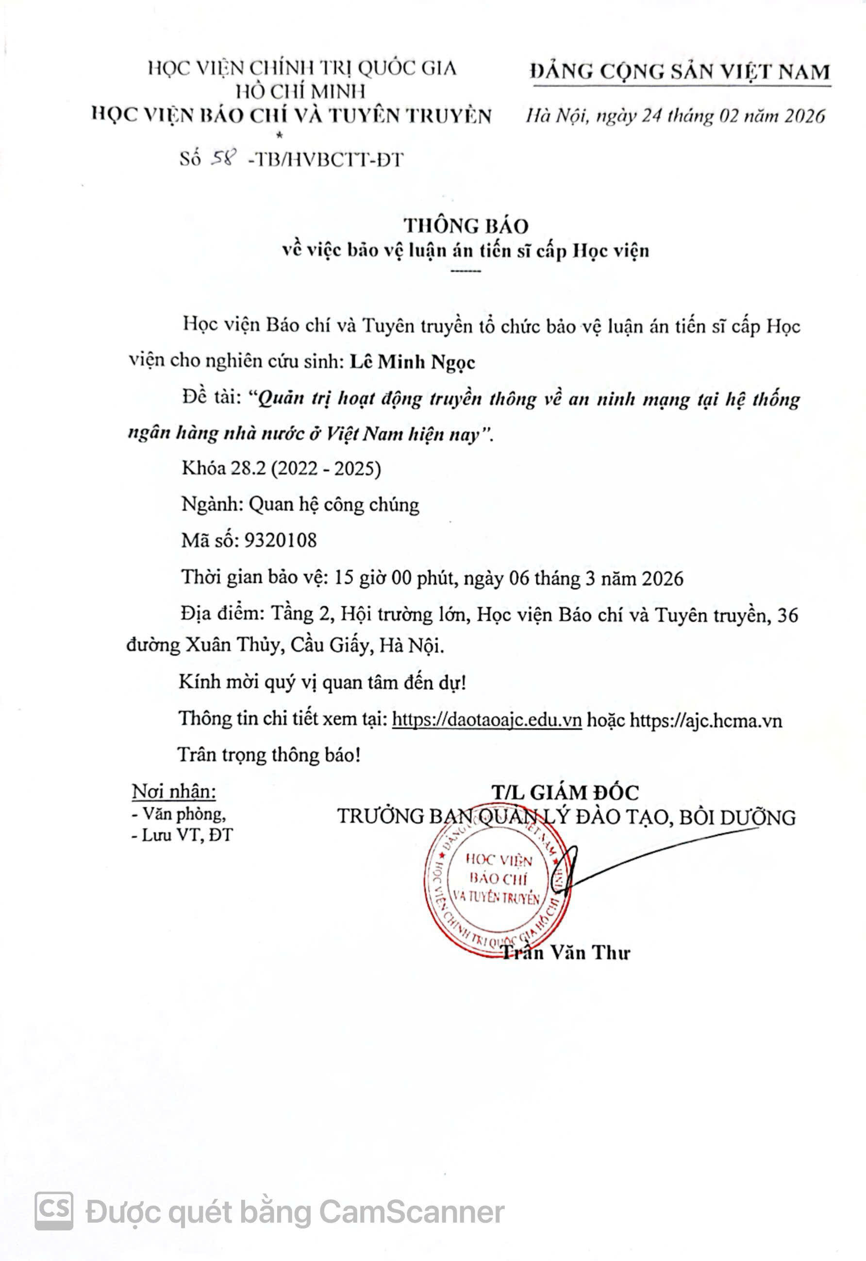 Học viện Báo chí và Tuyên truyền thông báo về việc bảo vệ luận án tiến sĩ cấp Học viện của nghiên cứu sinh Lê Minh Ngọc cụ thể như sau: