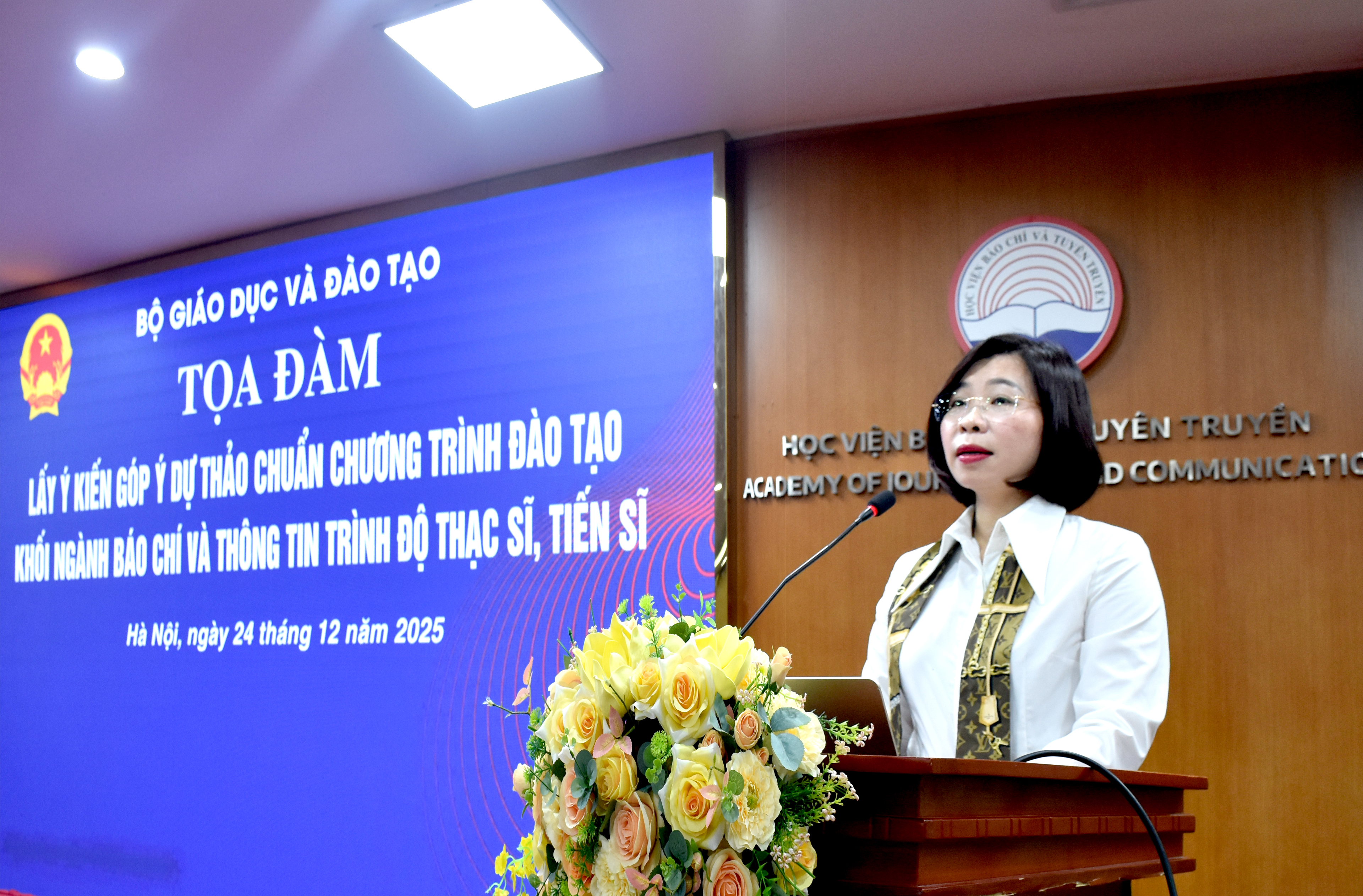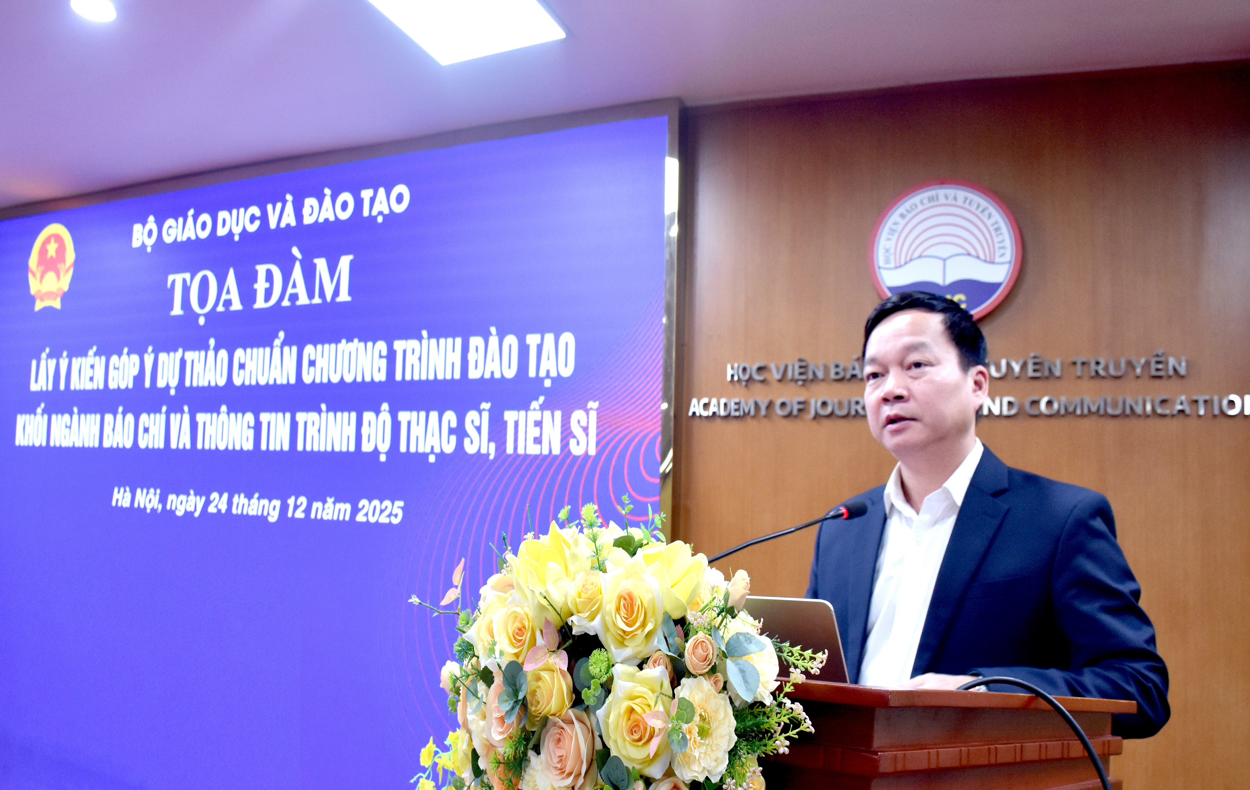 Sáng 24/12/2025, tại Học viện Báo chí và Tuyên truyền, Bộ Giáo dục và Đào tạo tổ chức Tọa đàm lấy ý kiến góp ý và thẩm định Dự thảo Chuẩn chương trình đào tạo khối ngành Báo chí và Thông tin trình độ thạc sĩ, tiến sĩ. Tọa đàm được tổ chức theo hình thức trực tiếp kết hợp trực tuyến, thu hút sự tham gia của đông đảo các nhà khoa học, chuyên gia, nhà quản lý và đại diện các cơ sở đào tạo trong cả nước.