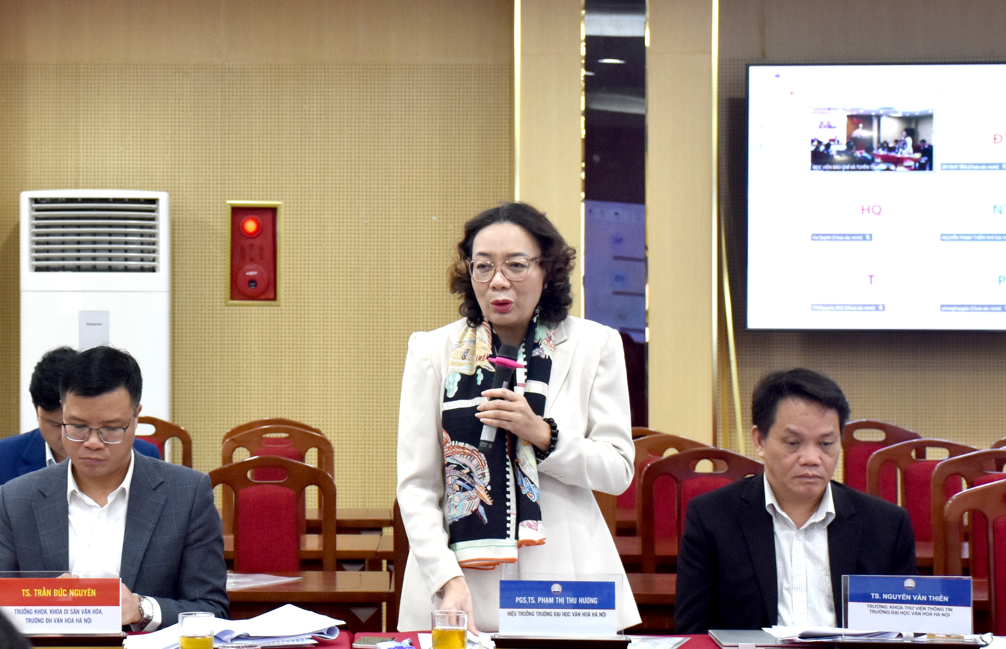 PGS, TS. Phạm Thị Thu Hương, Hiệu trưởng trường Đại học Văn hóa Hà Nội thảo luận, góp ý tại Toạ đàm