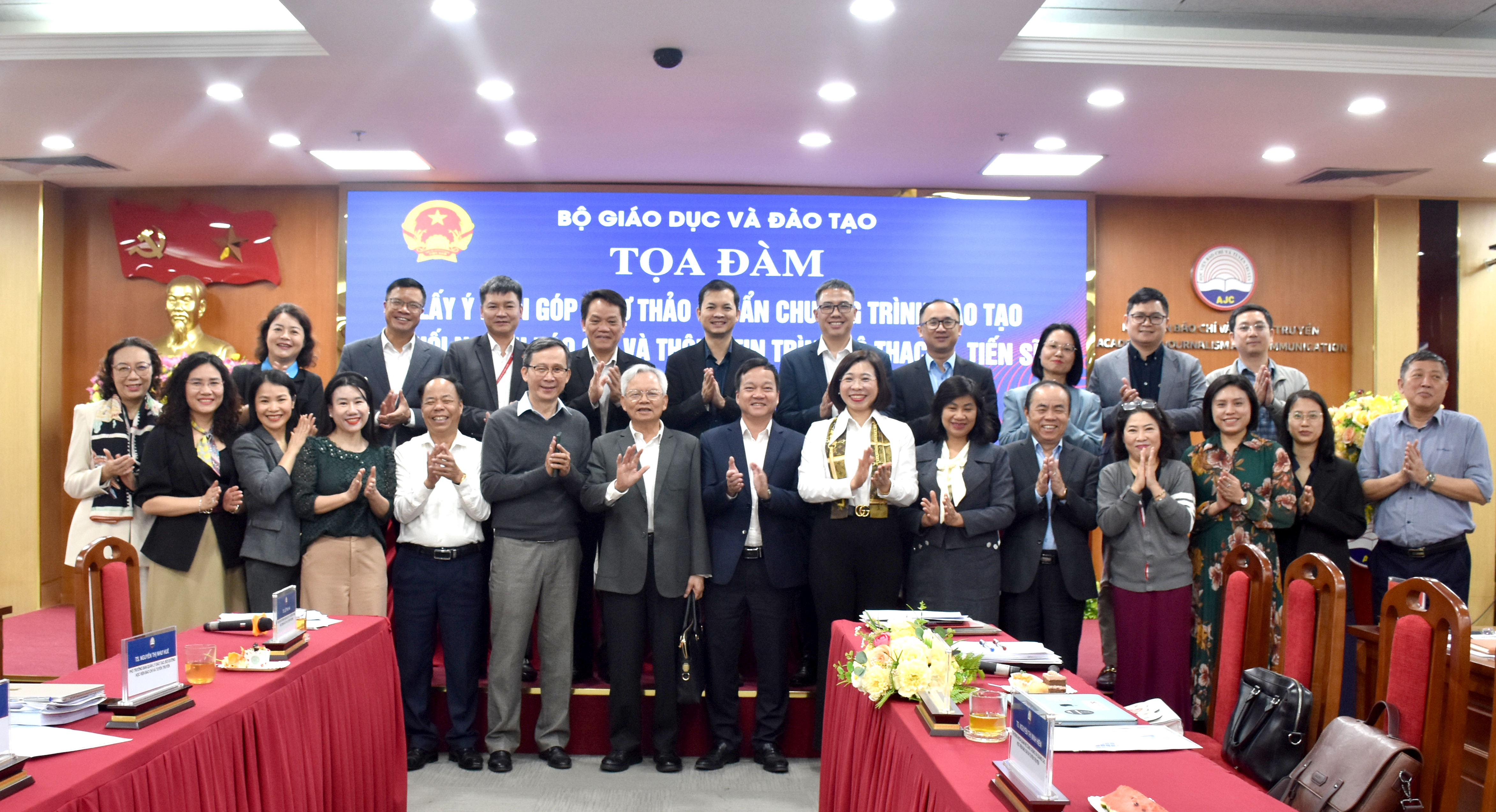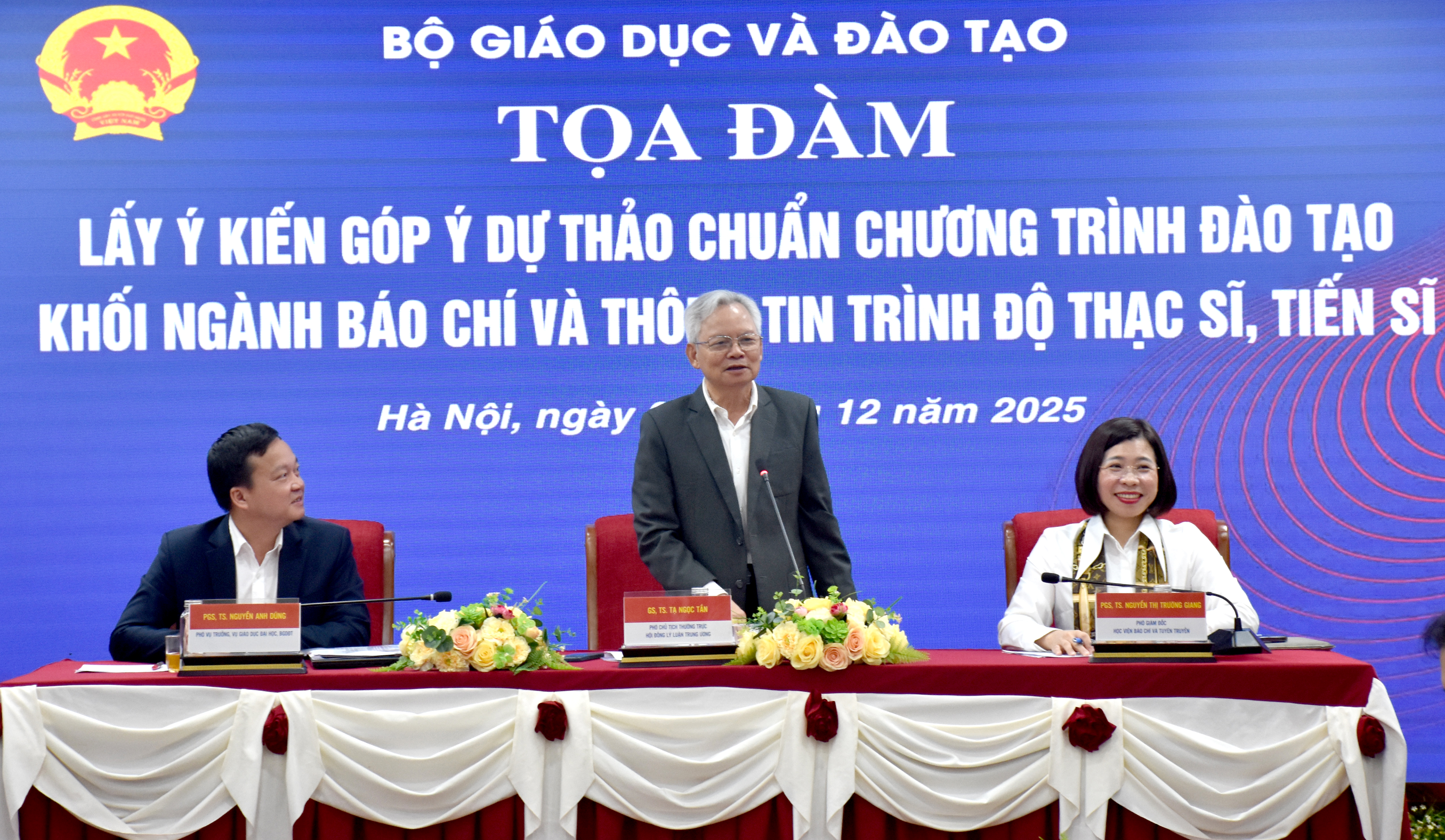 Toạ đàm lấy ý kiến góp ý và thẩm định Dự thảo Chuẩn chương trình đào tạo khối ngành Báo chí và Thông tin trình độ sau đại học tại Học viện Báo chí và Tuyên truyềnĐiều hành Toạ đàm có: GS, TS. Tạ Ngọc Tấn, nguyên Ủy viên Trung ương Đảng, nguyên Giám đốc Học viện Chính trị quốc gia Hồ Chí Minh, Phó Chủ tịch Thường trực Hội đồng Lý luận Trung ương, Chủ tịch Hội đồng thẩm định; PGS, TS. Nguyễn Anh Dũng, Phó Vụ trưởng Vụ Giáo dục Đại học, Bộ Giáo dục và Đào tạo; PGS, TS. Nguyễn Thị Trường Giang, Phó Giám đốc Học viện Báo chí và Tuyên truyền, Phó Chủ tịch Thường trực Hội đồng tư vấn xây dựng Chuẩn chương trình đào tạo khối ngành Báo chí và Thông tin trình độ thạc sĩ, tiến sĩ.