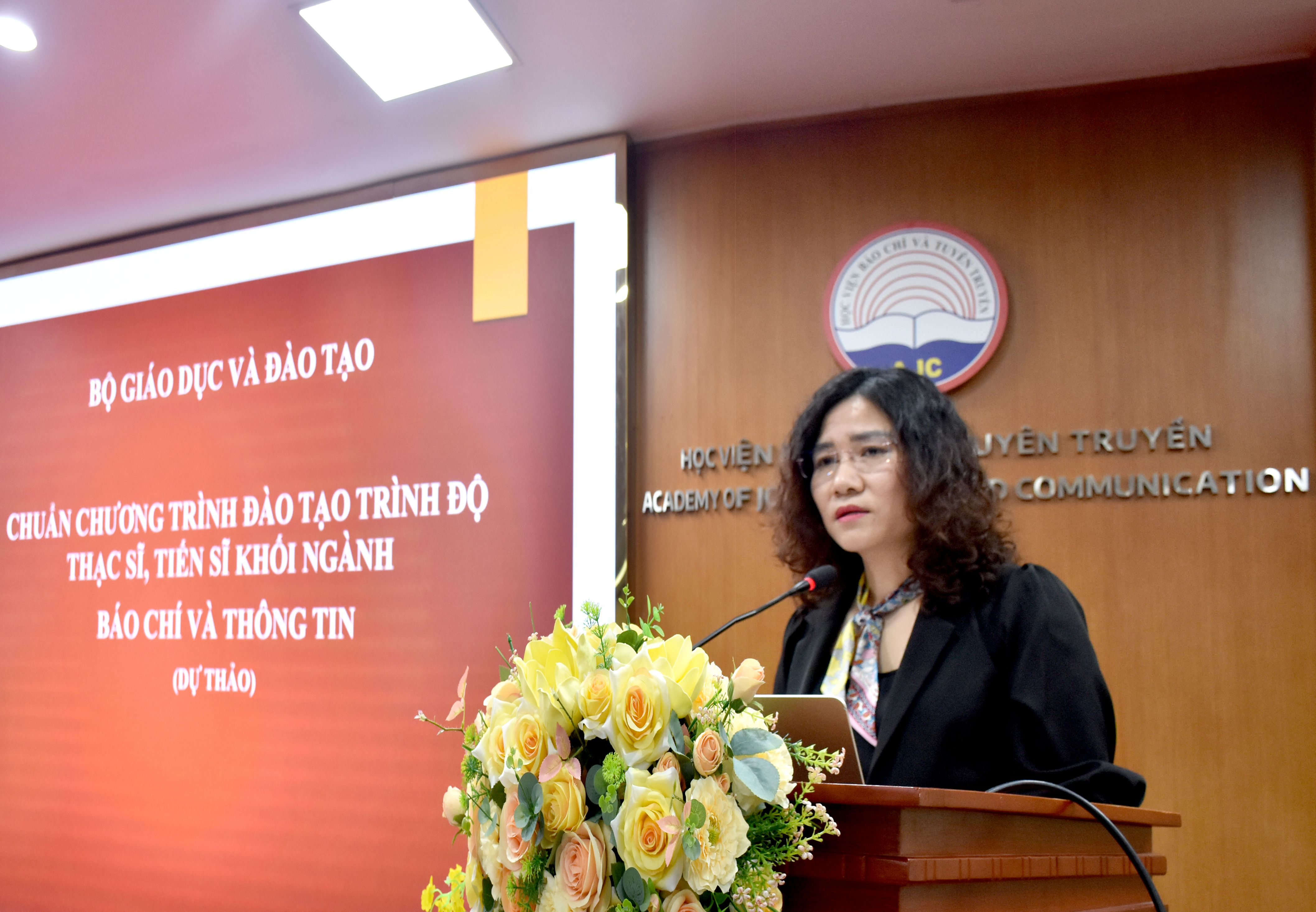PGS, TS. Nguyễn Thị Như Huế, Phó Trưởng ban Quản lý đào tạo, bồi dưỡng Học viện Báo chí và Tuyên truyền thay mặt Ban Thư ký trình bày Báo cáo tổng hợp quá trình xây dựng Dự thảo Chuẩn chương trình đào tạo khối ngành Báo chí và Thông tin trình độ thạc sĩ, tiến sĩ